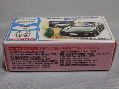 | 定番モデル6-18のボンネットに、ミニカーショップ「N's collection」のロゴを黒色タンポで施したもの。ビートなど他のトミカでも同様の商品が存在するがNSXは稀少。 | |||