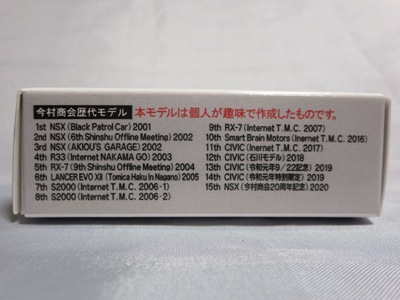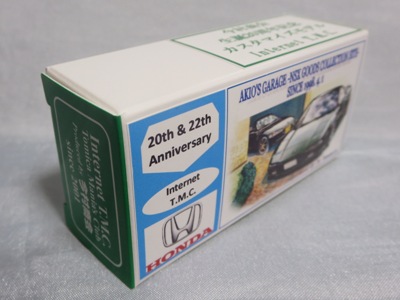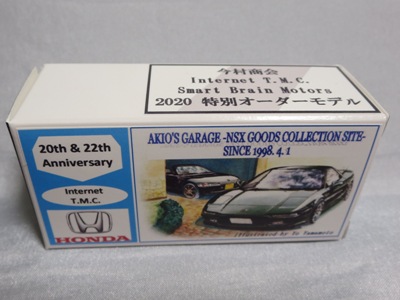 2020年2月1日より今村商会の公式サイトで受付が開始された今村氏の手による20周年記念シール貼付サービス(有料・価格は非公表・スマートブレイン仕様も同時に受付)に申し込み、1か月以上かけて送付するベースモデル39台を厳選し、4月4日に送ったものが、作業を終えて2020年4月19日に30台がまず戻ってきて、5月12日に残りの9台が戻ってきた。このモデルは第2陣として届いた9台のうちの1台である。 78-6-30アミューズメントモデルをベースとしたゴールドシール仕様である。 箱には今村商会オリジナルトミカ第6弾のイエローのS2000の画像がプリントされ、その反対の面には、当サイトのトップページのイラストを使用していただいている。 ゴールドシールは、市販モデルNo.6に使用されているものと同じ。 アミューズメントベースは、20周年記念カスタマイズモデルでも、スマートブレイン仕様でも、過去にヤフオクに出品された記録はない。 |