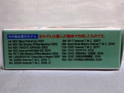2020年2月1日より今村商会の公式サイトで受付が開始された今村氏の手による20周年記念シール貼付サービス(有料・価格は非公表)に申し込み、1か月以上かけて送付するベースモデル39台を厳選し、4月4日に送ったものが、作業を終えて2020年4月19日に戻ってきたうちの1台。 市販された43トミカ4Dホワイトモデルベースの20周年記念モデルNo.4に使用されたものと同じ濃紺のシールが貼られている。 |