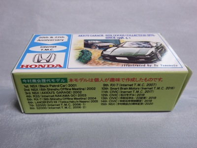 | Hマークは白色タンポ。フロントウインドーに「HONDA NSX」、サイドに「○HONDA NSX」と白色タンポが入る。2005年8月ヤフオクに6-9、10、16の3台セットが出品されたが、落札価格は10万近かった。 最近では2019年7月に出品されたものが76,000円、同年8月に出品されたものが66,500円、同年9月に出品されたものが60,000円で落札され、2020年に入ると5月16日に出品されたものが33,000円で、6月17日に出品されたものが19,050円で落札されている。 |