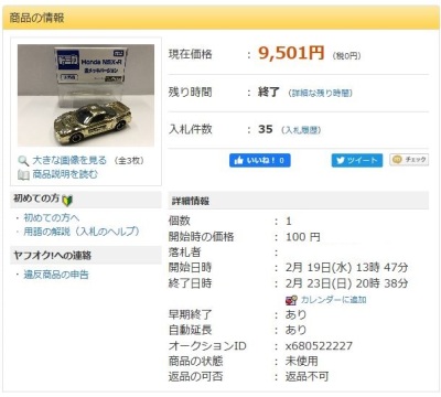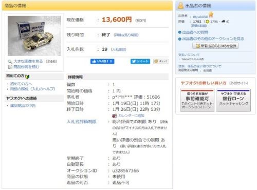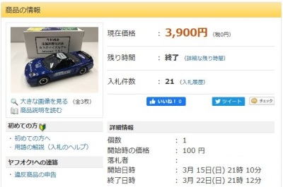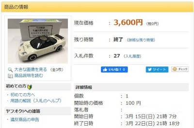 とのこと。購入先は不明。開始価格は100円で1月12日に3,910円で落札終了。