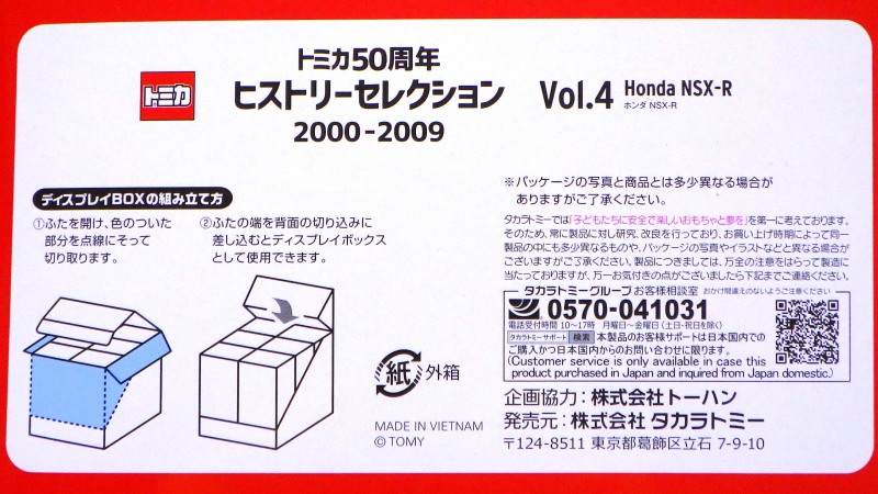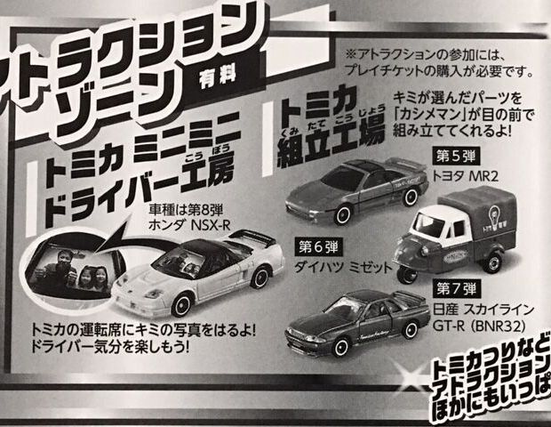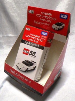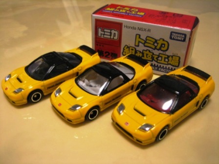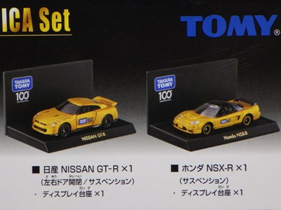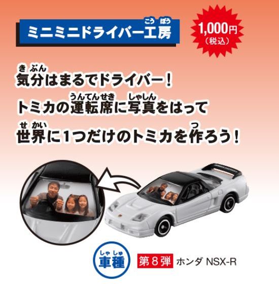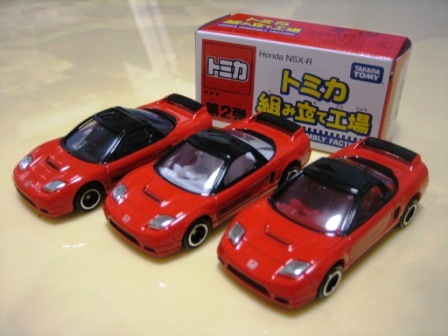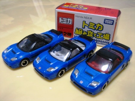 | 2008年4月25日〜5月6日ATCホールで開催されたトミカ博in大阪でNSX-R、R33GT-R、ハイエースの3車種を販売。3色ずつあるボディと内装を指定しスタッフに組み立ててもらう。ボンネットダクト、マフラーが塗装され両ドアに「TOMICA FACTORY」のタンポが入る。 | |||