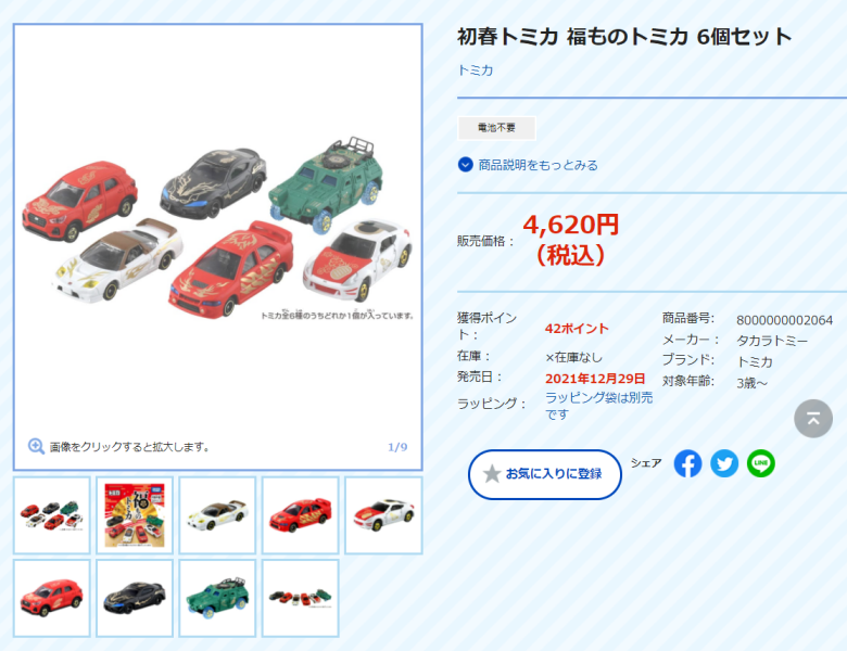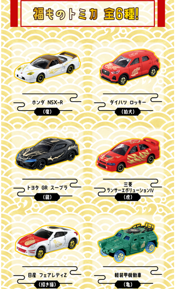 2021年12月28日にヤフオクにフライング出品されているのを発見し存在を知る(定価4,620円の6種セットが送料別5,500円で落札された)。 6種セットの内容は、NSX-R、スープラ、ロッキー、ランエボW、軽装甲機動車、フェアレディZ。 2021年12月29日の発売日にトイザらスで6種セットを発見。元々ばら売り商品で、トイザらスでは1個599円で販売されて おり、ブラインドボックスなのでやむなく6種まとめて3,594円で大箱ごと購入。 ヤフオクにあふれている商品の中からNSXだけの出品物を送料込みで1,000円程度で落札しても良かったのだが、大箱も欲しくてつい手を出してしまった(箱はグッズにはカウントしない)。 購入した6つの箱を計量すると、60g、60g、61g、65g、71g、72gという結果に。 NSXはこのラインナップからすると最軽量であろうと読み、60gの2つの箱のうちの1つを開封したら見事正解。 残りは、軽い順から、スープラ、ロッキー、ランエボW、軽装甲機動車、フェアレディZであった。 装甲車が一番重いだろうと予想していたが、ずんぐりとしたZが意外と重いことが判明。 そのデザインとドアの開閉ギミックのせいであると思われる。 |