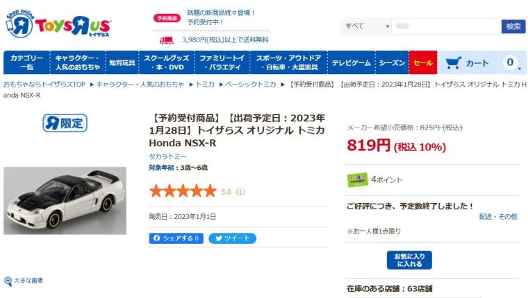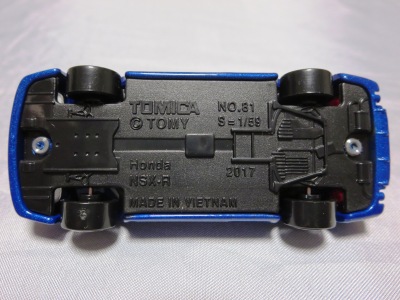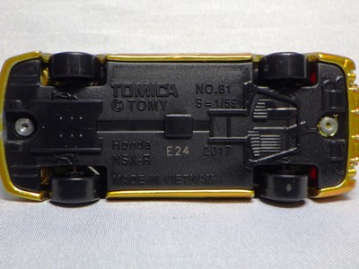 2023年1月1日にトイザらス限定で発売された。 1月4日に訪れたときにはすでに完売しており、やむなくヤフオクで購入した。 パッケージ裏面の刻印は「K1522」(2022年11月15日製造)で、裏板の刻印も同様に「K22」(2022年11月製造)となっていた。 変なオリジナルデザインではなく実在のNSX-Rプロトタイプ(東京モーターショー2001登場)を再現しているのがよい。 エブロでも2002年11月に1/43で商品化されている。 ホイールは2021年12月に発売された福ものトミカと同じゴールドリム。 |