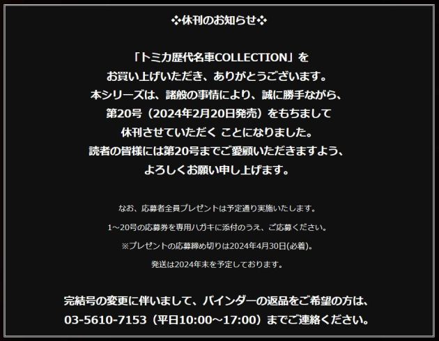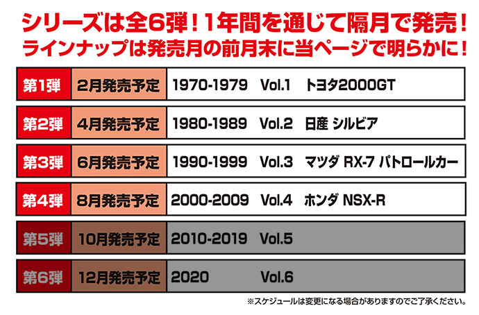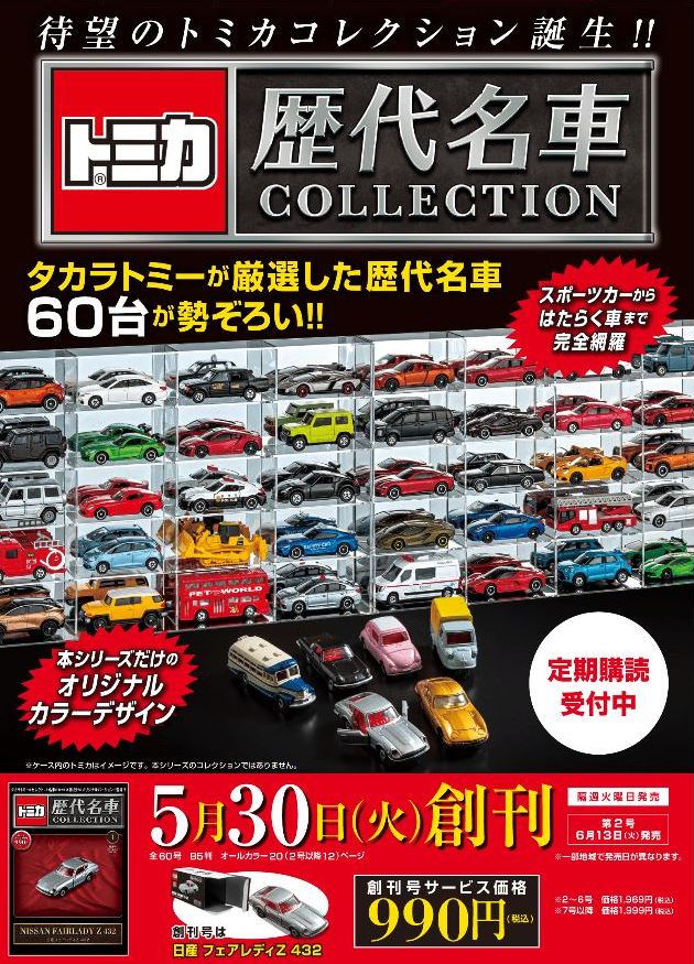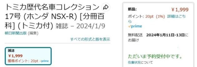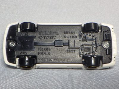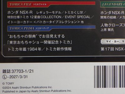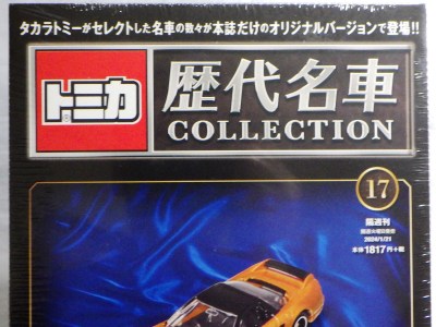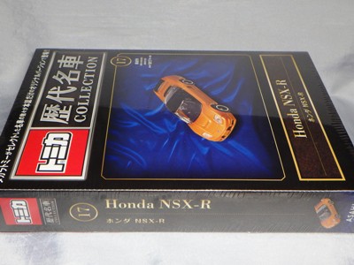2023年5月30日に創刊された朝日新聞出版「トミカ歴代名車コレクション」第17号として2024年1月9日に発売された(商品に表示されている発売日は2024年1月21日)。 ベースモデルはNA2を再現したトミカNo.81で、ボディカラーのオレンジは、この商品独自のオリジナルカラーとなり、過去の商品には存在しない。 ちなみにこのシリーズではホンダ車の登場は初めて。 ここまでのメーカー別発売車両は、トヨタ車が5台、日産車とスバル車が3台ずつ、マツダ車が2台、あとはダイハツ、いすゞ、三菱が各1台となっており、ホンダ党としては寂しい限り。 さらに寂しいことに、このシリーズは全60号で完結の予定だったのに、第20号での休刊が2023年12月に発表されている。 残る3台は日産リーフ、スバルインプレッサWRX タイプRA STi バージョンV、ランボルギーニカウンタックLP400となっている。 |
