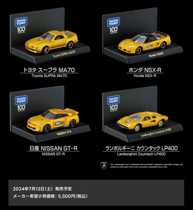 2024年7月13日に発売され、14日にamazonに注文したら15日に届いた。 トヨタ スープラ/日産 GT-R/ホンダ NSX-R/ランボルギーニ カウンタックLP400の4台セットだが、パッケージを見ると、一瞬スープラがNA1のNSXに見える。 2024年1月9日に発売された朝日新聞出版「トミカ歴代名車コレクション」第17号以来のNo.81の新作となる。 パッケージの刻印は「E2024」(2024年5月24日製造)。 後日単品の撮影のために、単品をわざわざヤフオクで追加で入手した。 |