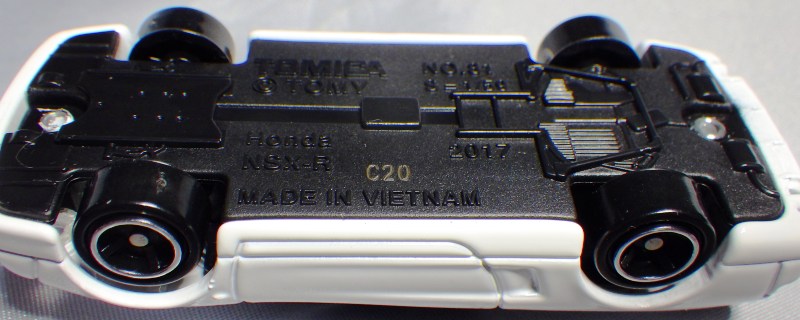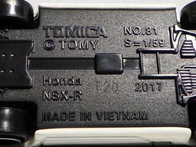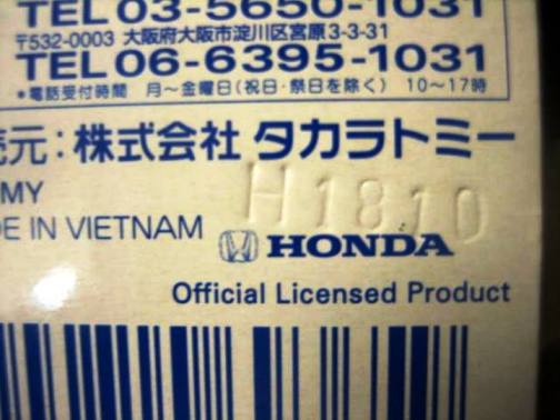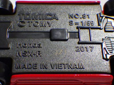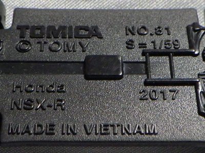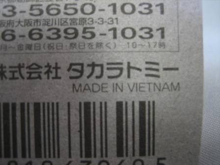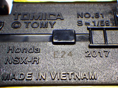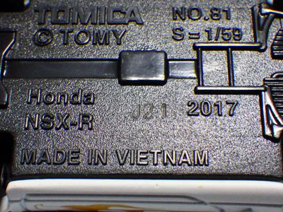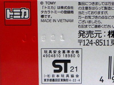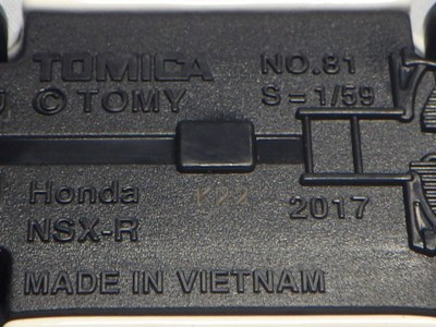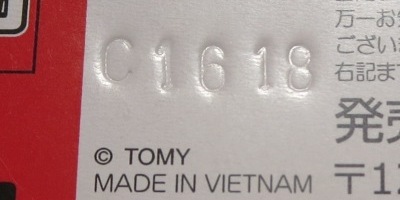 中国の人件費高騰により2009年末には全トミカの6割がベトナム製となり、2010年には全てがベトナム製になると発表された。自分が店頭で見つけた最も新しい中国製パッケージの刻印は「B2709」(2009年2月27日製造)、最も古いベトナム製パッケージの刻印は「L0109」(2009年12月1日製造)だった。その両者の間の時期の刻印入りのパッケージが見つかれば、移行時期がよりはっきりするはず。