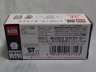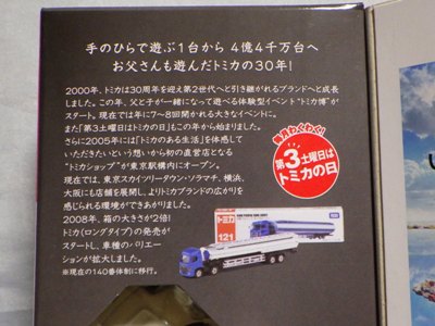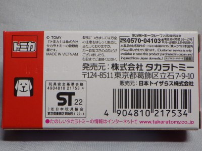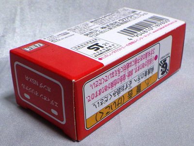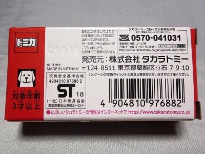 | 2010年12月18〜23日に 開催された「トミカ博 in 名古屋」にてゲームの景品として配付。パッケージの刻印は「H1810」(2010年8月18日製造)。 モデルも箱も特に変更はないが、継続的に生産されていることが伺える。義弟からのプレゼント。 | |||