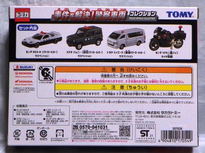 2021年4月17日発売。amazonにて購入(20%オフで\1,766)。 ホンダVFR(黒バイ)、トヨタハイエース(覆面パトロールカー)、スズキジムニー(巡回パトロールカー)、そしてNSX-R(パトロールカー)の4台セット。 81ベースのブーメラン型パトライト搭載のパトカーは、2004年6月発売の「トミカギフト緊急出動24時」に含まれるもの(パトライトの厚みやガラスの色による3種のバリエーションあり)と、2009年7月発売の「イトーヨーカドーパトカータイプコレクション」があるが、2013年12月発売の「トイズドリームプロジェクト・タルガ仕様」以降、81トミカはヘッドライトがメッキパーツからリアルなクリアパーツに変更されているため、今回の商品はクリアパーツヘッドライトを装備した初の81パトカータイプとなる。 商品はテープで封がされているため、パッケージ未開封のまま撮影している。 パッケージの刻印は「B2521」(2021年2月25日製造)。本体裏板の刻印は未開封のため不明。 |