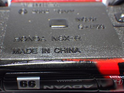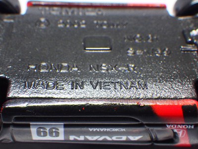 日に落札に成功。 「78トミカベース アドバンNSX No.42」1台と「81ベース アドバンNSX No.99」2台が同時に出品。 2024年10月に入手した78ベースはゼッケンナンバー「23」 だったが、2017年12月22日にヤフオクに初登場し、私が落札し損ねた、78と81ベースは共にゼッケンナンバー「25」であった。 今回登場78ベースは「42」という未知のモデルで、出品後すぐに入札したものの油断して結局落札し損ねた。 2017年12月にヤフオクに初登場させた宮城県の出品者の方のコメントによれば、ホビーショーで購入したもので、Mtnmodelが製作したものとのことだった。 そして2019年2月には、43トミカベースのNC1アドバン仕様がヤフオクに登場。 某コレクターがパッド印刷で製作したものとのことで、40台限定の19号車と22号車、60台限定の96号車と100号車の4種が存在し、さらにツヤありとツやなしバージョンが存在していた。 このモデルはいくつか入手することができたのだがCREATIVEというブランド名らしきロゴの入ったパッケージ付きだった。 ところが2021年2月に、78と81同様の「アドバンNEOVA」のロゴ入りパッケージ入りの43ベースの出品がスタート。 ミニカー自体はCREATIVE製のものと同じに見え、いまだにその成り立ちは謎のまま。 そして今回、このNEOVAボックス付きの78ベースNo.42と同時に登場したのが81ベースNo.99の2台。 こういう場合は、どちらか落札できれば…という思いで両方に入札するのだが、ライバルの入札者から予想していた反撃がなかったため81ベースを2台とも落札できてしまった。 最初は無駄遣いしてしまった!と凹んだが、届いたモデルを確認すると、1台は前期型の中国製、もう1台が後期型のベトナム製だったので本当にラッキーだった。 このモデルの製作者の方が、ベトナム製が販売され始めた時期(2009年夏頃)にベースとなるモデルを集め、製造国を気にすることなく製作されたことがうかがえる貴重な資料となる。 2台の違いは裏板の刻印のみだが、画像でも確認できるように中国製の方がヘッドライトのメッキ部分が若干ゴールドっぽく見える。 オリジナル箱のクオリティは高いが、全ての折り目に切り込みが入っており、フラップ(蓋)部分がちぎれそうなのが気になる。 |