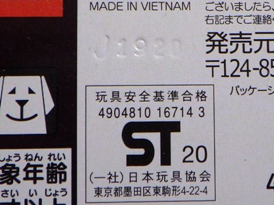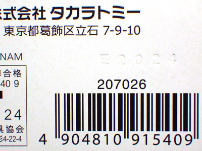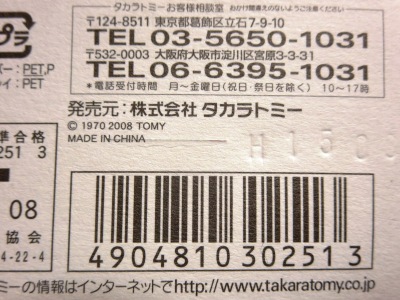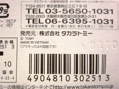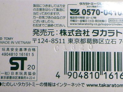 中国の人件費高騰により2009年末には全トミカの6割がベトナム製となり、2010年には全てがベトナム製になると発表された。 この商品も例外ではなく、通常品ほどではないが長期間製造されたため、発売時は中国製だったが、途中でベトナム製に変更になっている。 トミカのデザイン自体には変更はなく(はっきり確認できないが裏板の刻印は変更されているはず)、プラキッズに至っては中国製のままである。 中国製パッケージの刻印は「H1508」(2008年8月15日製造)、2018年12月に神奈川のコレクターの方が譲ってくださったベトナム製パッケージの刻印は「I0110」(2010年9月1日製造)となっており、2年以上製造されていたことがわかる。 |