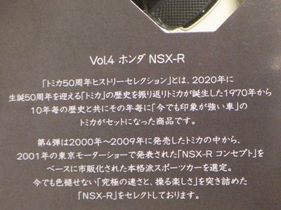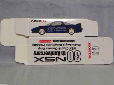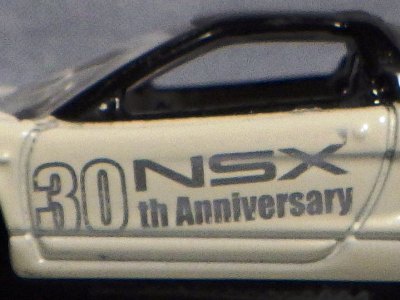 | 「NSX生誕30周年記念トミカ」全15種の中で、2020年10月10日にイベントモデルベースと共についに完成し、10月13日に届いた。 ヒストリーコレクションの発売を受けて急遽製作が決まったモデルである。 | |