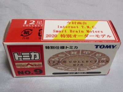 2020年2月1日より今村商会の公式サイトで受付が開始された今村氏の手による20周年記念シール貼付サービス(有料・価格は非公表)に申し込み、1か月以上かけて送付するベースモデル39台を厳選し、4月4日に送ったものが、作業を終えて2020年4月19日に戻ってきたうちの1台。 箱に新車シールの貼られた中国製の最初期モデル。スマートブレインのロゴシールはブラックで、箱にも同じものが貼られている。 81ホワイトベースのモデルはゴールドシールバージョンが過去にヤフオクに出品されている。 ブラックシールバージョンは有名なトミカコレクターのY氏のサイトで見ることができるが、そちらは後期型のベトナム製。 ちなみにY氏のサイトには81トミカベースのスマートブレイン仕様が8台掲載されており、そのうち今回のモデルも含め、奇しくも7種が私のオーダーしたベースモデルと同じで、そのうち5種がシールの仕様すらも同じであった。 Y氏が所有していて私が所有していない仕様は、イベントモデルNo.19ブルーベース/ゴールドシール(私の所有品はホワイトシール)、第37回東京モーターショーイエローベース/レッドシール(私の所有品はブラックシール)、シルバーメッキベース/ブルーシール(シルバーメッキベースのスマートブレイン仕様自 体未所有)の3種。 |