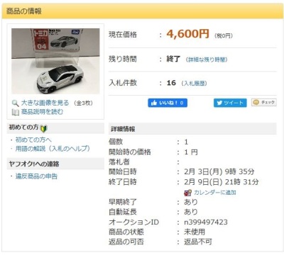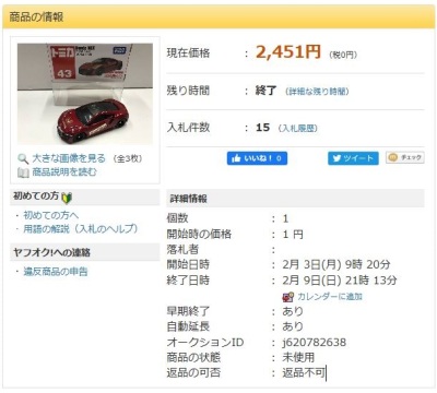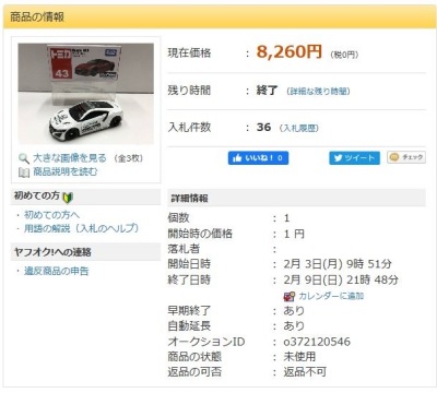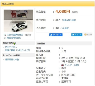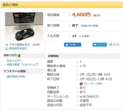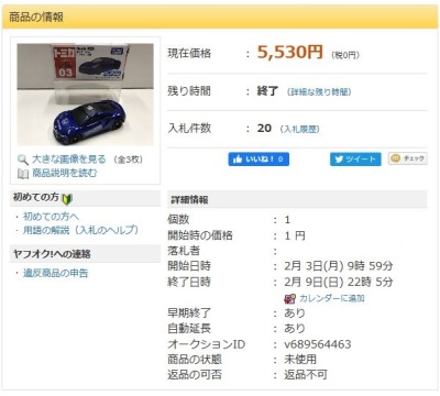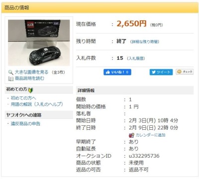 」という名称で出品されていた。 石川県から出品されたこの商品は12月31日に15,150円で落札された。 2020年1月2日に同じ石川県の別の出品者から再出品され1月5日に10,520円で落札された。 2020年1月14日に兵庫県から3度目の出品があり1月14日に 落札し、やっと入手できた。 2020年1月19日に石川県の出品者から4度目の出品があり1月26日に5,751円で落札された。 |