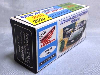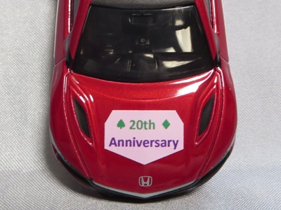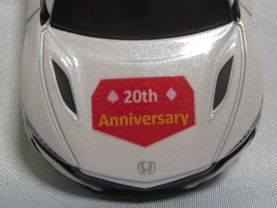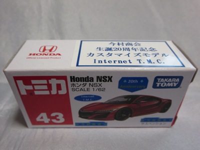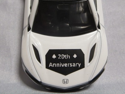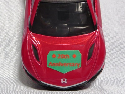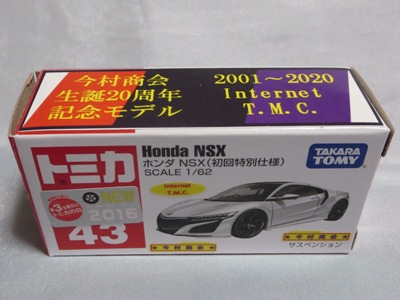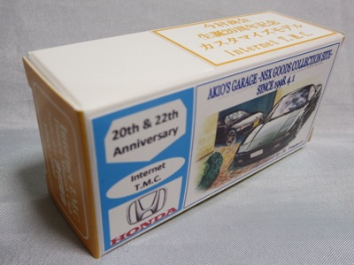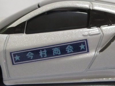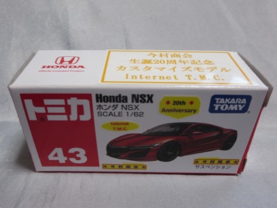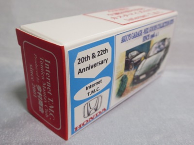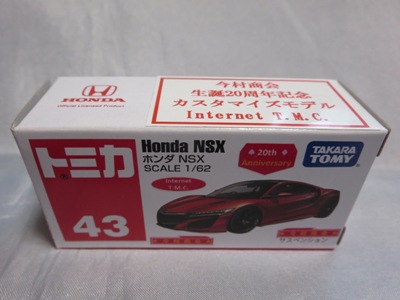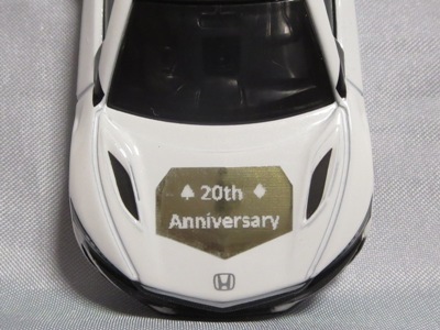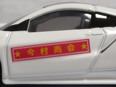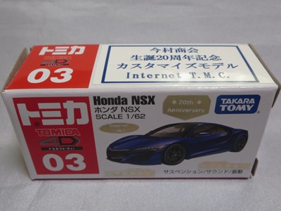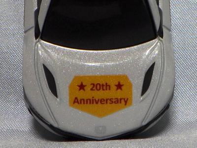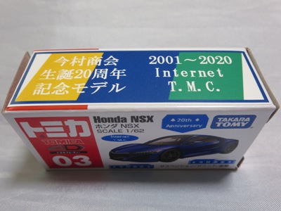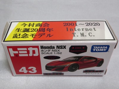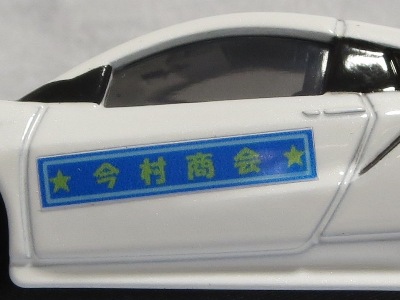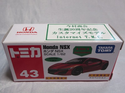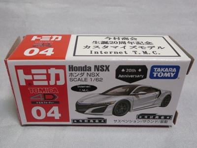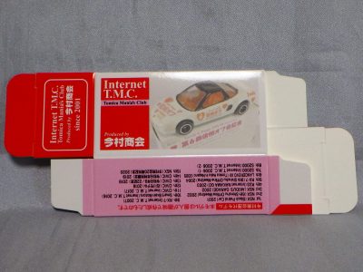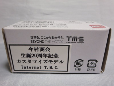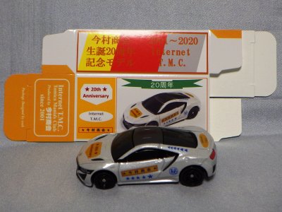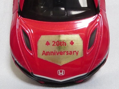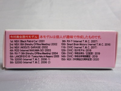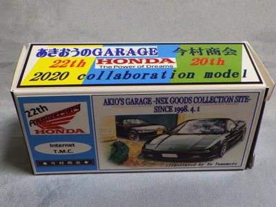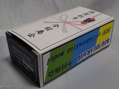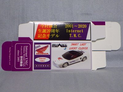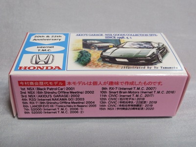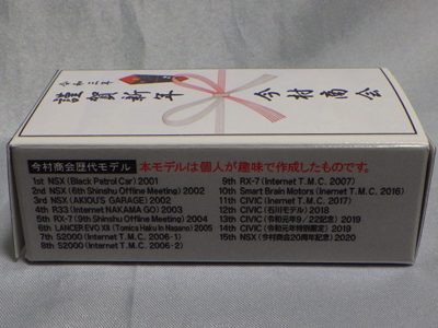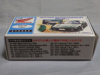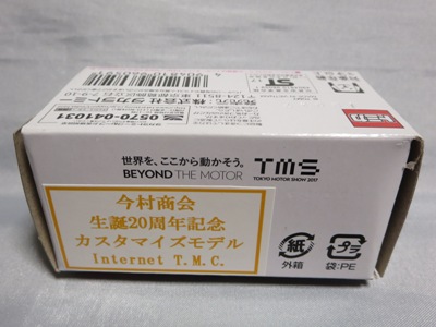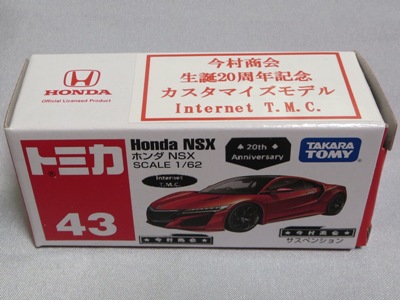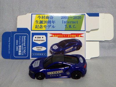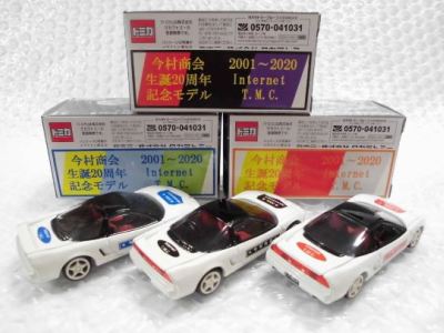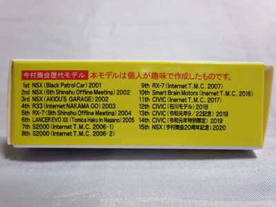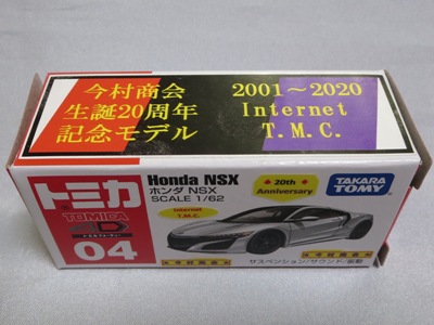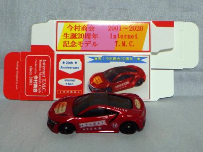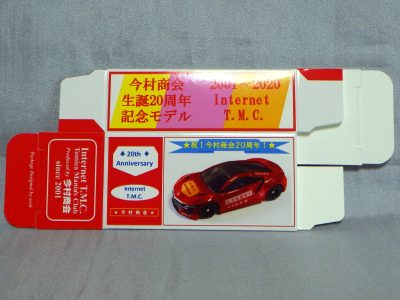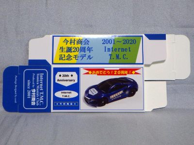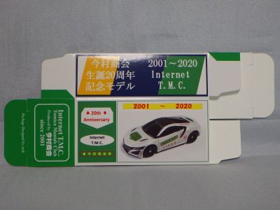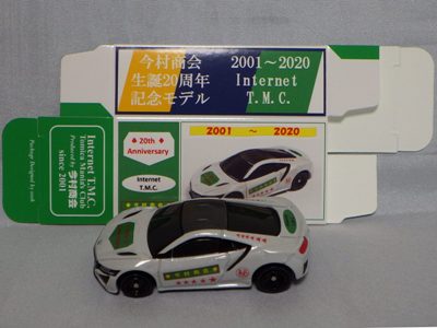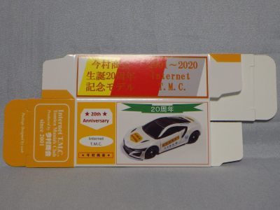 2020年2月1日より今村商会の公式サイトで受付が開始された今村氏の手による20周年記念シール貼付サービス(有料・価格は非公表)に申し込み、1か月以上かけて送付するベースモデル39台を厳選し、4月4日に送ったものが、作業を終えて2020年4月19日に戻ってきたうちの2台。(ホワイトベースモデルは6種製作していただいた。) ブラックシールは市販された記念モデルNo.9(通常品レッドベース)に貼られていたものと同じ。ゴールドシールは市販されたモデルNo.6(トミカ4Dブルーベース)に貼られていたものや、2017東京モーターショー開催記念モデルに貼られていたものと同じである。モデルNo.8(通常品レッドベース)もゴールドシールだが、そちらのサイドシールは文字が抜けていてボディカラーが透過するタイプ。 箱に貼られた大きいシールはカスタマイズモデル用ではなく、ブラックシールモデルは市販モデルNo.9と同じもの、ゴールドシールモデルは市販モデルNo.8と同じものが使用されている。 |