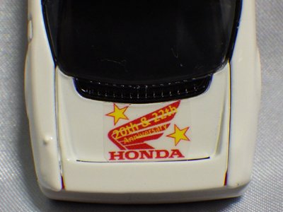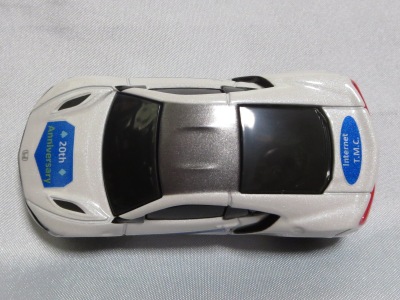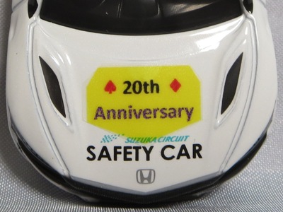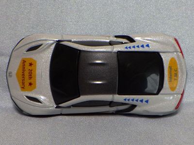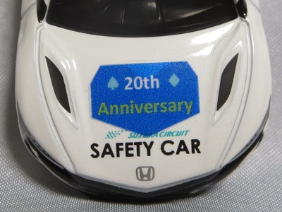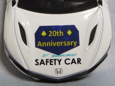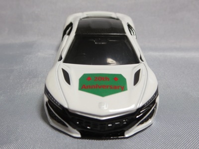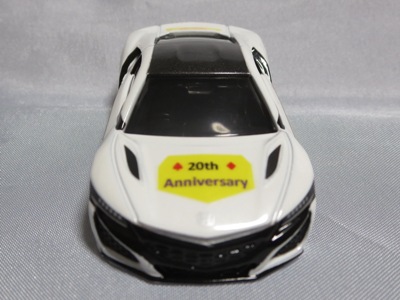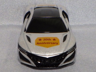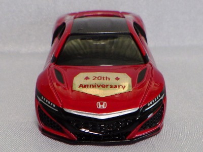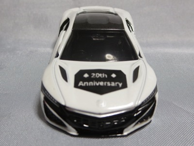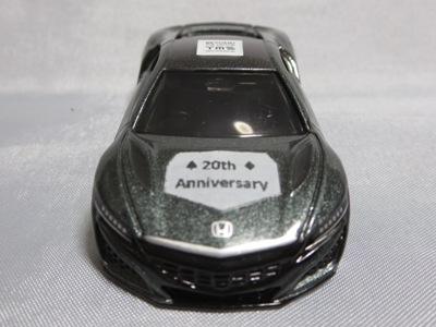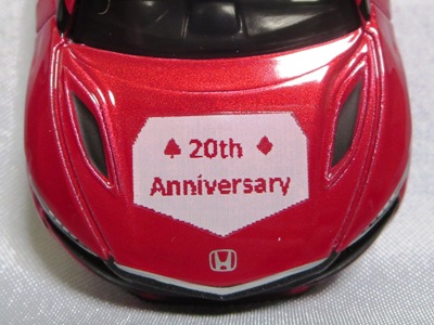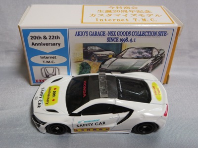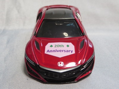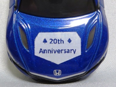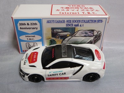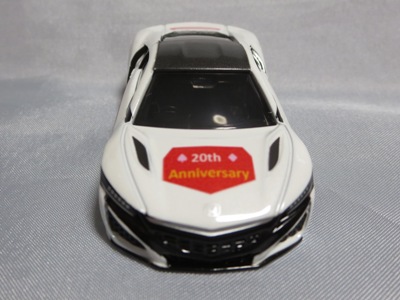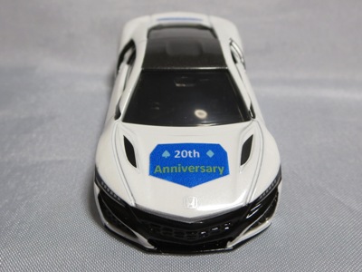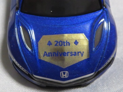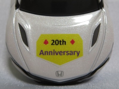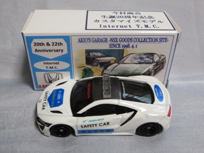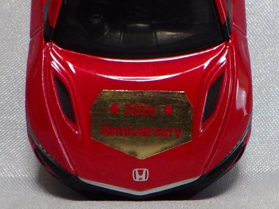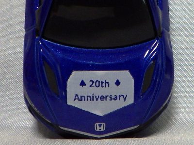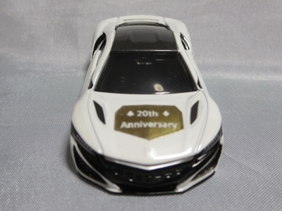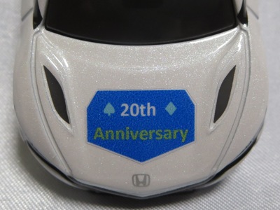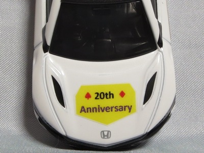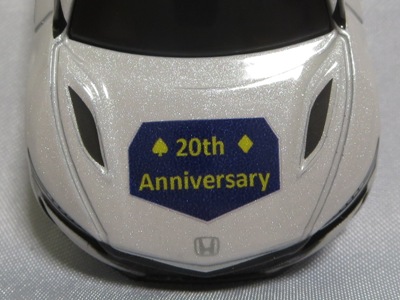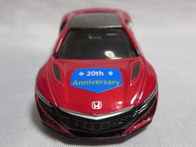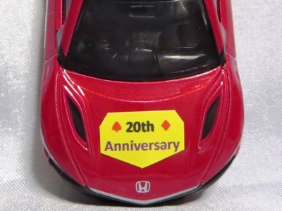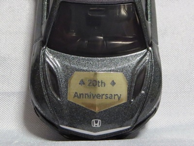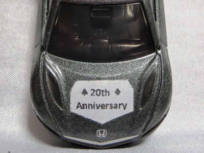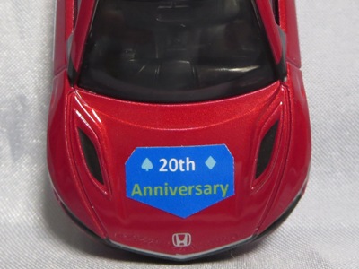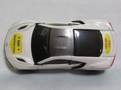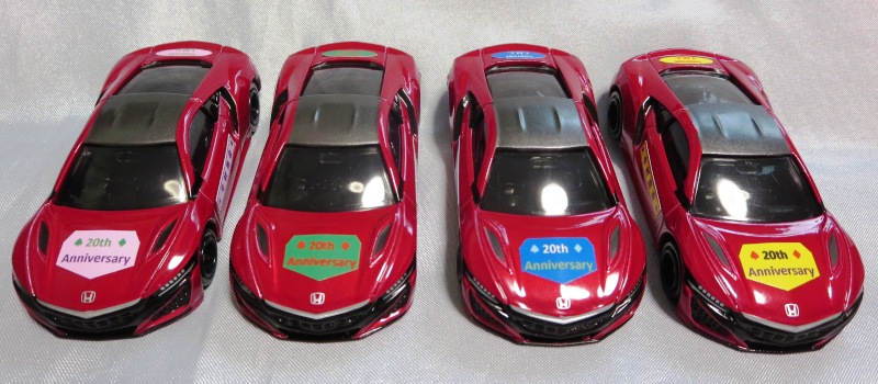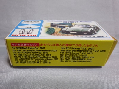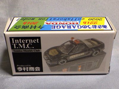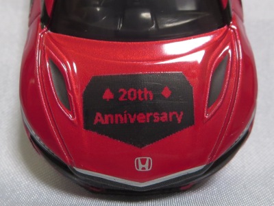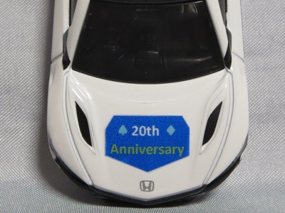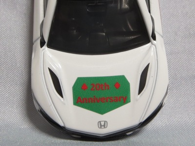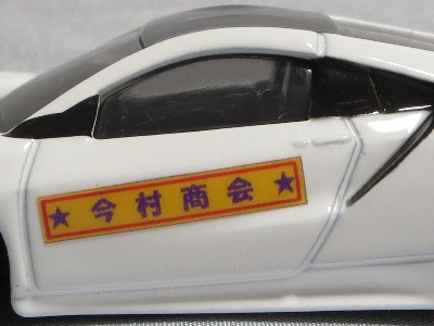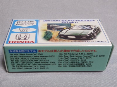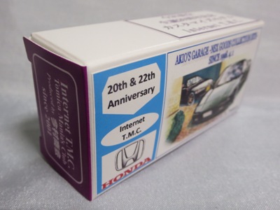 2020年2月1日より今村商会の公式サイトで受付が開始された今村氏の手による20周年記念シール貼付サービス(有料・価格は非公表)に申し込み、1か月以上かけて送付するベースモデル39台を厳選し、4月4日に送ったものが、作業を終えて2020年4月19日に戻ってきたうちの2台。(ホワイトベースモデルは6種製作していただいた。) ブラックシールは市販された記念モデルNo.9(通常品レッドベース)に貼られていたものと同じ。ゴールドシールは市販されたモデルNo.6(トミカ4Dブルーベース)に貼られていたものや、2017東京モーターショー開催記念モデルに貼られていたものと同じである。モデルNo.8(通常品レッドベース)もゴールドシールだが、そちらのサイドシールは文字が抜けていてボディカラーが透過するタイプ。 箱に貼られた大きいシールはカスタマイズモデル用ではなく、ブラックシールモデルは市販モデルNo.9と同じもの、ゴールドシールモデルは市販モデルNo.8と同じものが使用されている。 |