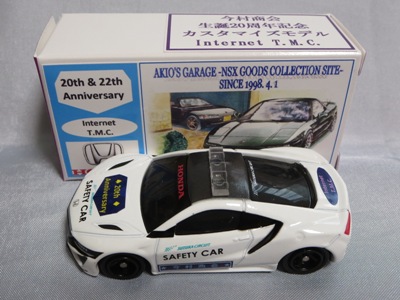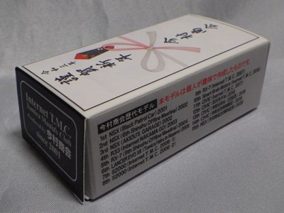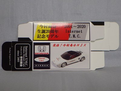 2020年2月1日より今村商会の公式サイトで受付が開始された今村氏の手による20周年記念シール貼付サービス(有料・価格は非公表)に申し込み、1か月以上かけて送付するベースモデル39台を厳選し、4月4日に送ったものが、作業を終えて2020年4月19日に戻ってきたうちの1台。 39台のうち15台が20周年カスタマイズモデル仕様で、19台がスマートブレイン仕様であった。個人レベルでの正規特注モデルとして画期的な製品であった120-3-10NSXブラックパトカーをそれぞれに1台ずつ用意した。 ベースモデルは20年前の発売時に直接今村商会から購入させていただいたもので、20年間ずっと冷暗所で保管していたためベストコンディション。 箱も同様に未組立で大事に保管していたものを、今回の送付にあたり初めて組み立てた。 シールは20周年記念カスタマイズモデル同様にゴールドを指定した。 |