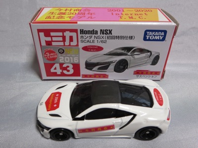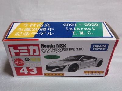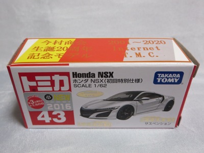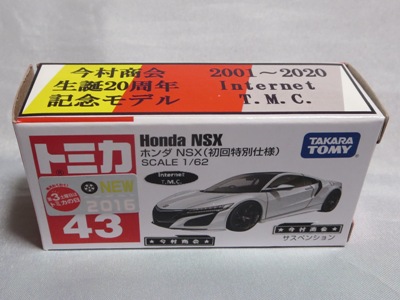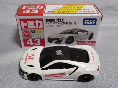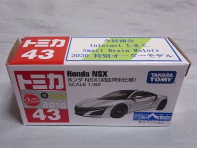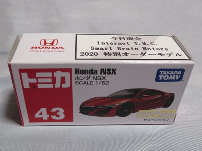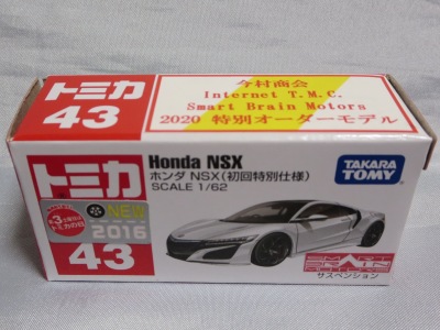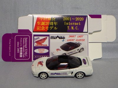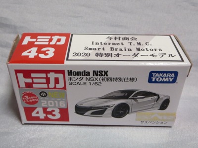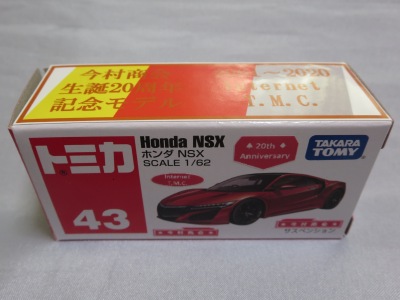 2020年2月1日より今村商会の公式サイトで受付が開始された今村氏の手による20周年記念シール貼付サービス(有料・価格は非公表)に申し込み、1か月以上かけて送付するベースモデル39台を厳選し、4月4日に送ったものが、作業を終えて2020年4月19日に戻ってきたうちの1台。 ベースは2016年に43NSXが初登場した時の初回限定カラーで、これと通常品レッドベースモデルで製作された2種が2017年1月に今村商会からリリースされたのが、スマートブレイン仕様の最初で、その時のホワイトベースのシールカラーはブラックであったが、今回はゴールドで、箱にも同じものが貼られてい る。 この後の紹介になるが、レッドシールバージョンとブルーシールバージョンも製作していただいた。 ゴールドシールバージョン のみ、2020年2月にヤフオクに出品された記録がある。 43ベースのスマートブレイン仕様は、2017年登場の通常品2種、4Dブルーベース、2017東京モーターショーベース、2019東京モーターショーベース 、上記の通常品レッドシールに続いて7種目となる。 |