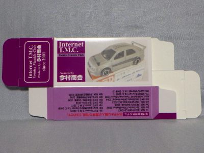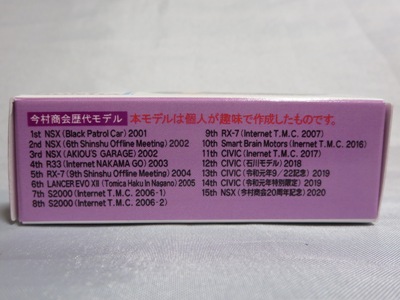 2020年2月1日より今村商会の公式サイトで受付が開始された今村氏の手による20周年記念シール貼付サービス(有料・価格は非公表・スマートブレイン仕様も同時に受付)に申し込み、1か月以上かけて送付するベースモデル39台を厳選し、4月4日に送ったものが、作業を終えて2020年4月19日に30台がまず戻ってきて、5月12日に残りの9台が戻ってきた。このモデルは第2陣として届いた9台のうちの1台である。 43セーフティカーベースの20周年記念モデルは4種をオーダー。これはその中のネイビーシールモデルである。 箱には今村商会オリジナルトミカ第6弾のランエボ7の画像がプリントされ、その反対の面には、レッドシールモデル同様に当サイトのトップページのイラストを使用していただいている。 ネイビーシールは、市販モデルNo.4に使用されているものと同じ。 セーフティーカーベースのネイビーシール仕様は、過去にヤフオクに2回出品された記録がある(レッドシール仕様と同じく2020年3月と4月)。 |