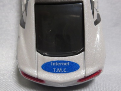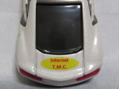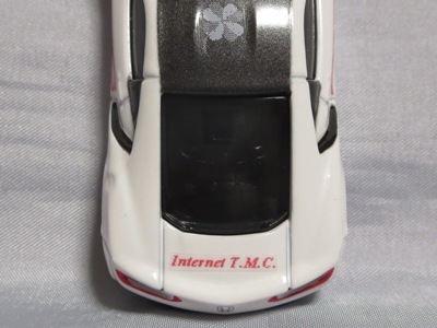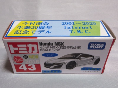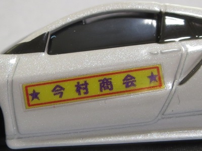 2020年2月1日より今村商会の公式サイトで受付が開始された今村氏の手による20周年記念シール貼付サービス(有料・価格は非公表)に申し込み、1か月以上かけて送付するベースモデル39台を厳選し、4月4日に送ったものが、作業を終えて2020年4月19日に戻ってきたうちの1台。 市販された43トミカ4Dホワイトモデルベースの20周年記念モデルNo.4に使用されたものと同じネイビー(濃紺)のシールが貼られている。 |