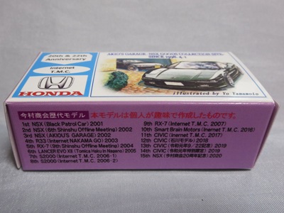 このHP「あきおうのGARAGE」 オリジナルとなる「NSX生誕10周年記念モデル」製作を提案してくださり、製作にも協力してくださったのが「今村商会」さん。その「今村商会」の今村氏が所属するトミカコレクターのグループが「信州オフ」です。「今村商会」がこれまでにリリースしたNSXのトミカモデルの中で入手できたものを簡単に紹介させていただきます。 |