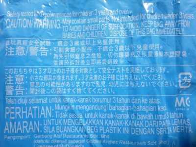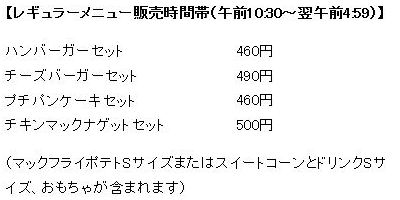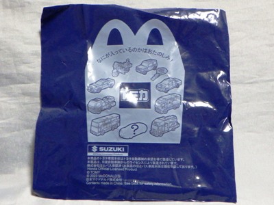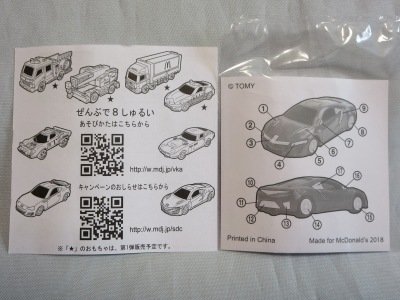 NSXは発売日の4月27日より5日前の4月22日に先行入手した人物がヤフオクに出品し、それを落札して入手。 通常品同様ベトナム製だが、実物は予想以上にトミカとはかけ離れたもので、まずサイズが大きい。通常品の全長7cm(1/62)に対し、こちらは9cm(1/50)。 箱のサイズも、通常品が4.0×8.0×2.7cmに対し、こちらは4.5×10.0×4.0cm。 本体も通常品がダイキャスト製なのに対し、チープなプラスチック製。ガラス部は別パーツだが、クリアなのはエンジンが覗けるリアのみ。 しかし、ハンバーガーセット価格460円のうち、ハンバーガー100円、マックフライポテトS150円、ドリンクS100円とすると、オマケのミニカーは110円。通常トミカの価格486円の4分の1以下でリアハッチ開閉機構まで盛り込んだミニカーが手に入るわけなので、幼児用のオモチャとしては十分に頑張っていると言える。 ハッピーセットの内容と価格は左記の通り。ブレックファストメニュー販売時間帯には、ハンバーガーセットとチーズバーガーセットが、ホットケーキセットとエッグマックマフィンセット(各490円)に変わる。 |