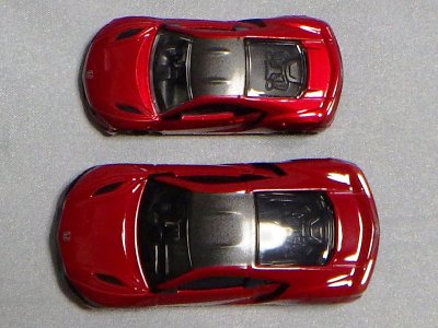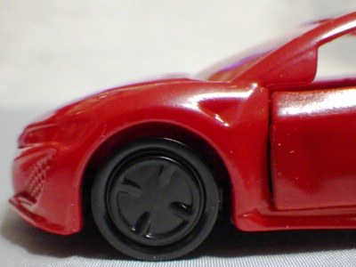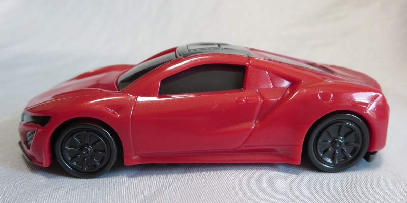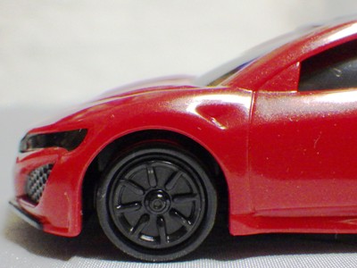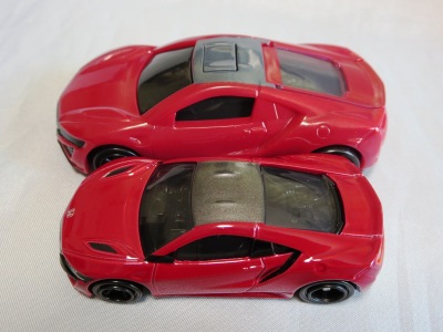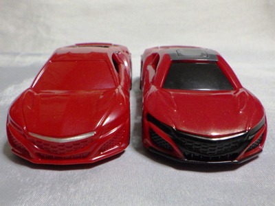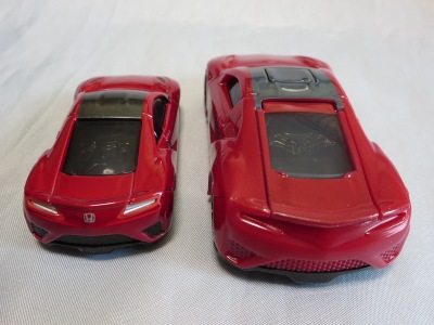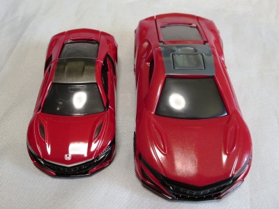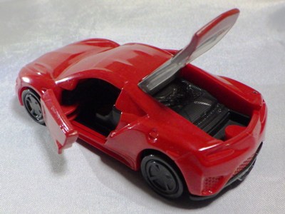 2018年4月にマクドナルドのハッピーセットトミカとして登場したNSX(NC1)が2023年4月28日再登場。 4月14〜27日に配布された2023年第1弾4種に続く、4月28〜5月11日に配布された第2弾の4種と同時に配布されていたシークレットモデルの「ひみつのおもちゃ」の正体がNSX。 先代の商品をベースにしつつも様々な点が変更されている。 先代はフロントグリルとルーフがブラックに塗り分けられており、ルーフのボタンを押すとエンジンフードが開閉するというギミックがあったが、今回の商品はエンジンフードの縁がブラックになっている以外はレッド一色で、フードは開閉するものの、ルーフボタンに反応するといったギミックはない。 その代わり、両ドアが開閉するギミックが追加されており、それに伴い内装が再現されている。 他には、ホイールが先代のものは8本スポークのリアルなディテールがあったのだが、今回のものはシンプルなトミカ風のデザインになっている。 エンジンフードは今回のものの方が大きく開き、中のエンジンのモールドは今回のものの方がリアルに仕上がっている。 ビニール袋によるブラインドパッケージであるのは前回と共通だが、先代に付属していた通常トミカ風の箱は付属しない。 コストは、基本的な型は使い回しているにしても、同じくらいかかっているのではないだろうか。 |