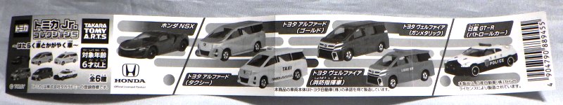 5台のカプセルトミカが付属し、ブリスターパックされていた。迷路は全部で6種類。NSX(赤)に関する過去のカプセルトミカとの差異は以下の通り。 @カプセルトミカ…裏板刻印「©2001 TOMY YUJIN CHINA」 リアナンバー部あり ダッシュボード上の数字「38」? Aブリキ缶トミカ…裏板刻印「©2005 TOMY YUJIN CHINA」 リアナンバー部はチェーン取り付け部に改造 ダッシュボード上の数字「82」? B迷路絵本トミカ…裏板刻印「©TOMY T-ARTS MADE IN CHINA」 リアナンバー部なし ダッシュボード上の数字「18」? |