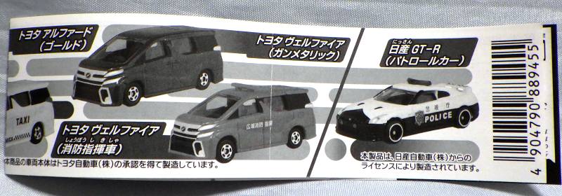 | 2003年11月永岡書店より発売。絵本に、Newソアラ(オリジナルカラー)、古河ホイルローダー、NSXパトカーの3台のカプセルトミカが付属し、ブリスターパックされていた。即完売した。 | 2005年8月発売。カプセルトミカにチェーンをつけ缶ケースの中に入れたものをカプセルに入れて販売された。裏版をチェーン取り付け部を設置するため新造したので刻印が2001から2005に変わっている。 | ||