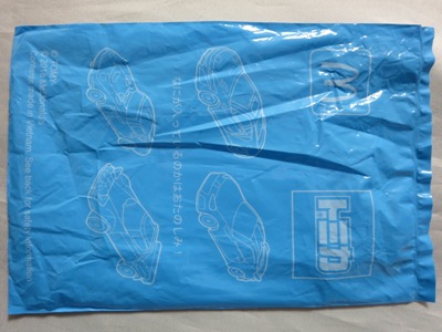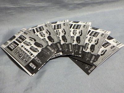 | 2005年8月発売。カプセルトミカにチェーンをつけ缶ケースの中に入れたものをカプセルに入れて販売された。裏版をチェーン取り付け部を設置するため新造したので刻印が2001から2005に変わっている。 | 2016年5月オークションにて入手。新車として発売された時に箱に貼られるシール。未貼付品が一般に出回ることはない。出品者は他車種のシールも大量に出品した。3.2×6.2cm。 | ||