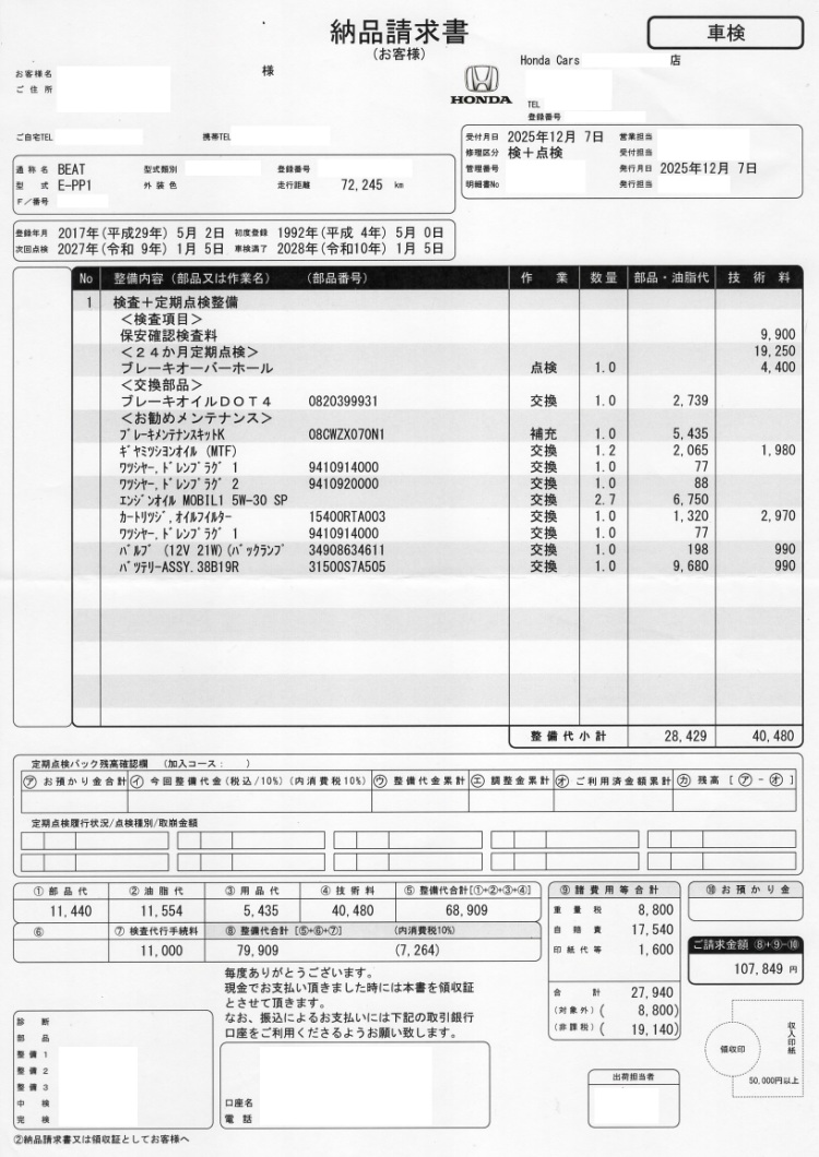 11月24日、ビートを16回目の車検に出しました。今年の4月から2か月前車検が可能になったので、雪が降り始める前に出せました。次男にディーラーまでCR-Zで付き合ってもらい、そのまま乗せて帰ってもらったため代車はなし。