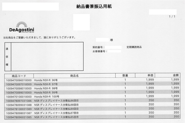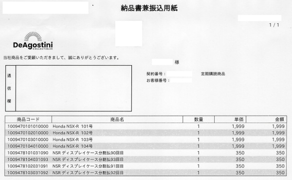2025年12月27日に届いた巨大な段ボール箱の正体は、それまで毎月1回届くマガジン代と一緒に、350円ずつの分割払扱いになっていたデアゴスティーニ1/8「週刊ホンダNSX-R」ディスプレイケース。 第12号から110号まで99回の分割払になっていたので、350円×99回=34,650円。 NC1のときもベース19,800円、カバー12,800円で、合計32,600円という高額商品だったが、それを超えてきた。 とりあえず未開封のまま保管。 |