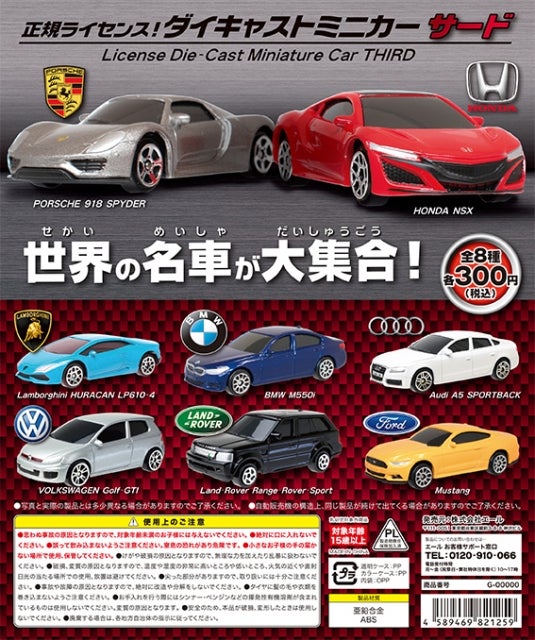 2021年12月30日にプラッツのカプセルトイと同時発売になり、同時にヤフオクに出品されたものを落札した。 2021年10月に入手したボックスタイプのものも発売元はエールであった。 エールは2008年に東京で設立された玩具・雑貨の企画・製造・販売・輸入を行っている会社。 取り扱い商品のメインは、かわいい動物系のカプセルトイで、ミニカーは珍しい。 今回の商品のラインナップは、ホンダ・NSX(NC1)(ホワイト)のほか、ランドローバー・レンジローバースポーツ(グリーン)、ランボルギーニ・ガヤルドLP 570-4スーパーレジーラ(イエロー)、ダッジ・チャレンジャーSRTデーモン(オレンジ)、ベントレー・コンチネンタルGT(ネイビー)、日産GT-R(レッド)、BMW・M5(ブルー)、アウディR8V10(ブラック)となっている。 |
