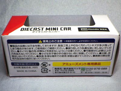 2018年10月28日にヤフオク初登場の現地箱入り新型ホンダNSX2色セットは落札できず。 2019年3月13日にレッドのみがカプセル入り商品と同価格の300円で出品され17日に落札。 販売元の現地仕様が個人輸入で日本に出回っているものだと思っていたのだが、実は日本語シールの貼られた正規輸入品で、アミューズメント施設のクレーンゲームの商品として日本国内で普通に流通しているということが判明。 裏板の白文字タンポの番号は、「H155437」となっており、カプセル玩具バージョンとは異なる。箱側面の番号も同じ。 |