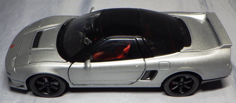 | オークションにて購入。組立式で単3電池2個(別売)とモーターで走行可。スケールは1/40。 | 2002年9月上旬発売。トランスフォーマーシリーズのロードポリス。どこにもNSXという記載はないが明らかに形はNSX。車形態時の全長約55mm。 | ||