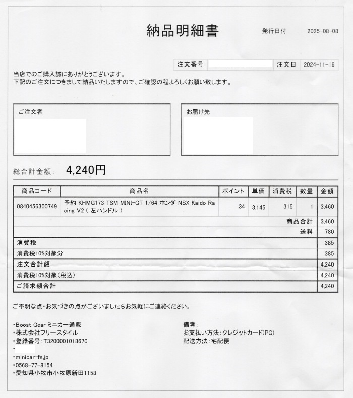2019年12月2日にヤフオクに初登場した1/64 MINI-GT「MGT00052-L Honda NSX GT3 #86 2017 IMSA Watkins Glen LHD」のMijoパッケージ(おそらく品番は「MGT-00052-MJ」)。 送料は無料となっていたが、即決価格は3,432円と決して安くはなかった。商品説明をよく読むと、「amazonの段ボールにて発送されることがあります」という記載があったので、もしやと思い、amazonをチェックすると、2,420円(送料無料)で販売されているのを発見。 当然ヤフオクの方へは入札せずamazonに注文した。ちなみにこの商品の取扱開始日は11月20日であった。 「MGT00051-L Honda NSX GT3 #30 2018 24 Hours of Spa LHD」のMijoパッケージ(こちらの品番はおそらく「MGT-00051-MJ」)も同じ出品者(以前Linxのプルバックカーを購入したことのあるA-kind)がamazonに出品していたので同時注文した。なぜかこちらは2,999円とやや高く、取扱開始日も1日ずれた11月21日であった。 注文した翌日の12月3日に両方とも届いた。12月3日現在、正規品は国内未発売である。 12月4日になって、A-kindが12月2日から4日にかけてこの2種を数点ずつヤフオクに出品していたことが判明。 送料は別とはいえ、開始価格は1,899円と比較的良心的。なぜか入札はなし。 |