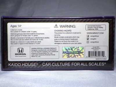 2023年9月22日に受注が開始され、2024年4月26日に発売された(ヤフオク初登場は4月22日)。 当初はシュリンクパックを開封する予定はなかったのだが、この商品には一定の割合で限定のチェイスカーが入っている可能性があるため運試しで開封。残念ながらハズレだった。 高額モデルだけあって質感は非常に高く、トミカプレミアムを超える。 日系アメリカ人カスタムカー・デザイナー、JUN IMAI(ジュン・イマイ)がプロデュースする人気シリーズ「KAIDO HOUSE × MINI GT」の新作の一つで、KAIDO HOUSE初のホンダ車であり、南カルフォルニアのパフォーマンススポーツ及びチューニング会社である「Evasive Motorsports(エヴァーシブ・モータースポーツ)」とのコラボモデル。 2024年2月29日に受注開始をお知らせしたシリーズNSX第2弾の1/64「KHMG119 ホンダNSX Kaido Racing V1(左ハンドル)」も発売が待たれる。 |