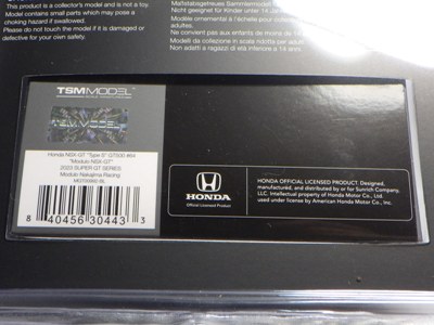 2019年4月15日に受注が開始され、6月発売予定であったが、7月31日に発売された。 受注時の商品名は「ホンダ NSX GT3 東京オートサロン2018」、発売時の商品名は「ホンダ NSX GT3 2018東京オートサロン LHD」であった。 この商品名変更で、アキュラ仕様ではないホンダ仕様なのに左ハンドルとなっていることに初めて気がついた。 確認したら実車も確かに左ハンドルであった。 シュリンクパックを開封するのがためらわれたので、未開封のままボックスの画像のみ撮影。 |