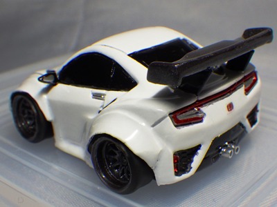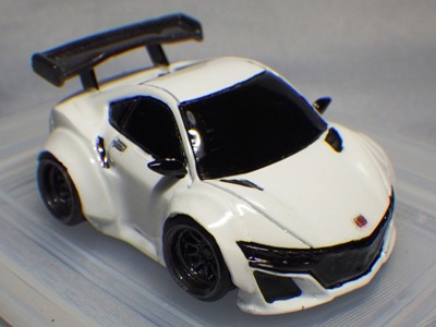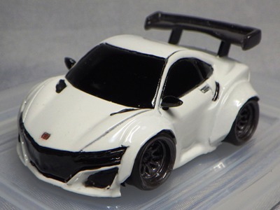 | 2002年12月28日発売。全12種の中に通常品のNSXレーシングの色替えモデル(黒)がラインナップされた。ブラインドパッケージ仕様の商品だが、薄いアルミ袋入りなので手触りでピンポイント購入が可能であった。車高の低さと、ごついリアウイングが見分けるポイント。 | |||