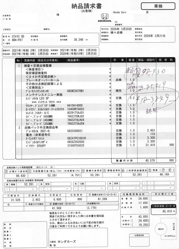 昨日2度目の車検に出していた奥さんのシビックが本日返ってきました。
