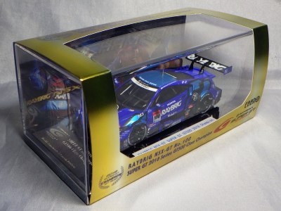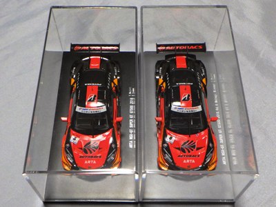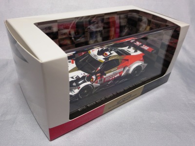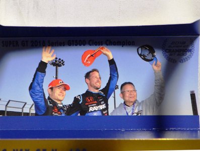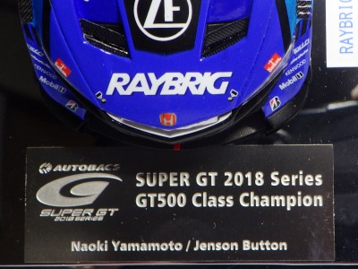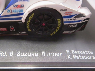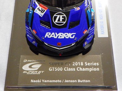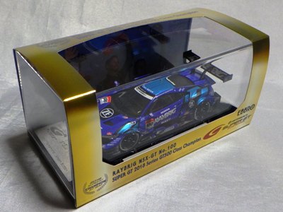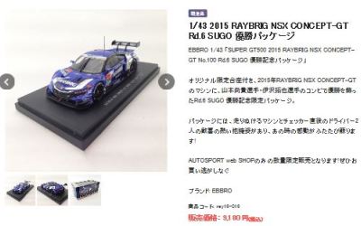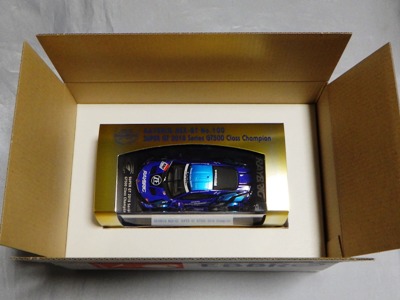 | 2016年11月21日にレイブリック・チーム国光から、Rd.6 SUGO仕様が優勝記念パッケージとしてAUTOSPORT web SHOPにて22日の正午から販売開始となる旨の発表があった。1年前から発売がアナウンスされていた通常品となる「Rd.1岡山」仕様は11月18日に発売され、こちらは限定の背景が付属するが、岡山仕様は通常のチェック模様となる。台座も、こちらは「Rd.6」「Winner」といった文字こそ入っていないものの、岡山仕様にあった「Rd.1 Okayama」という文字は消されている。ミニカー自体は全く同じ。限定数は不明。即完売した模様で、25日にはSHOPサイトから商品が消えていた。 | |