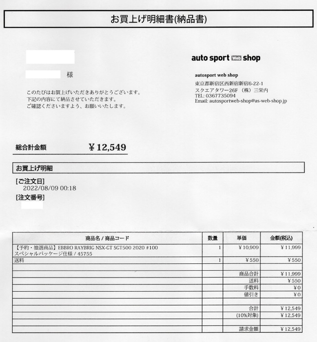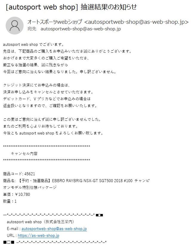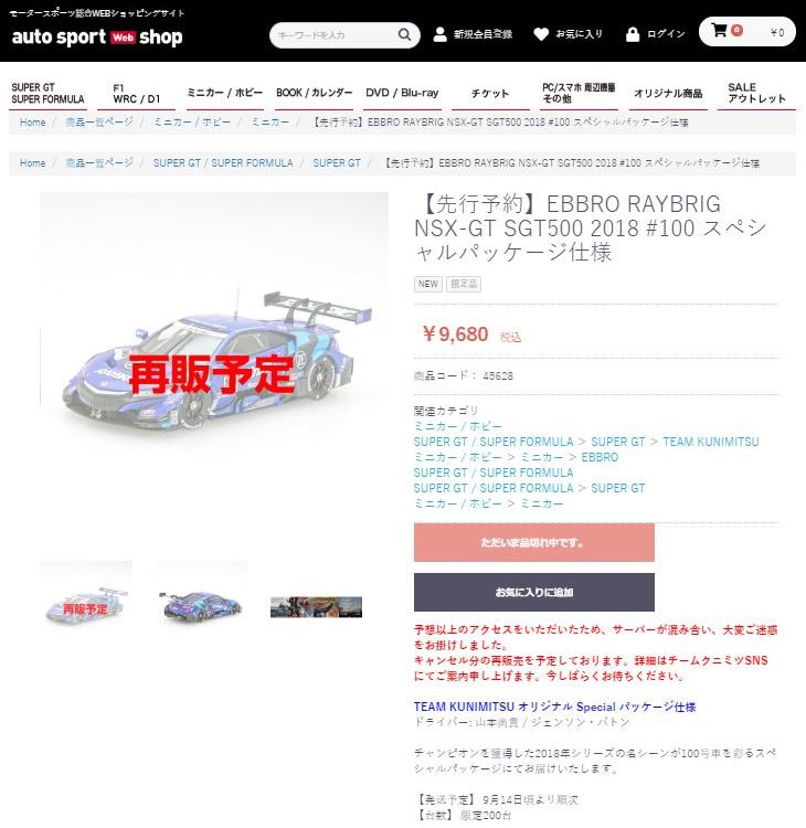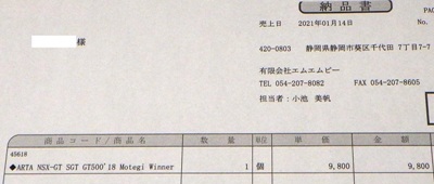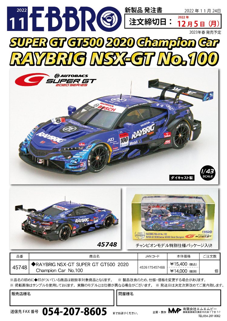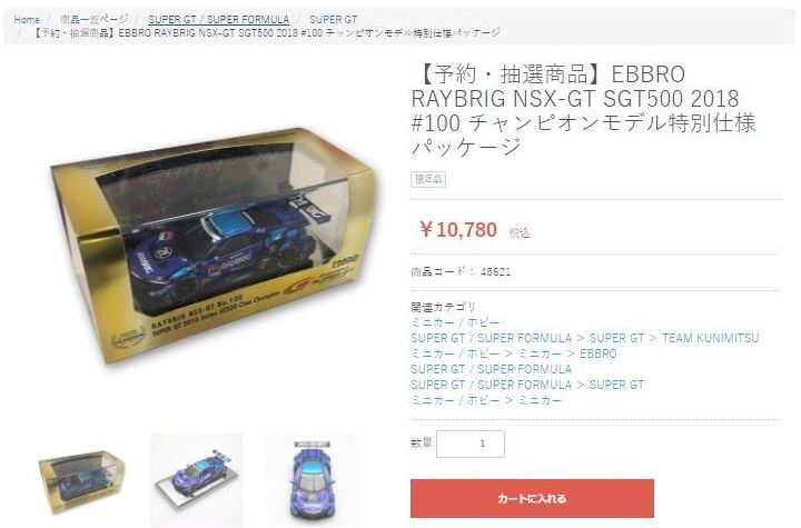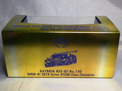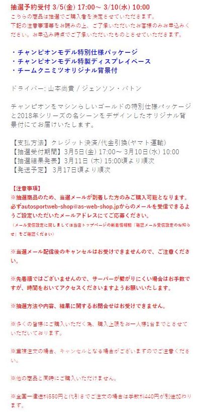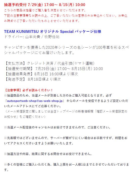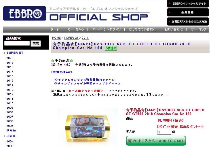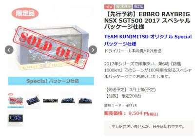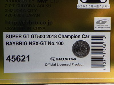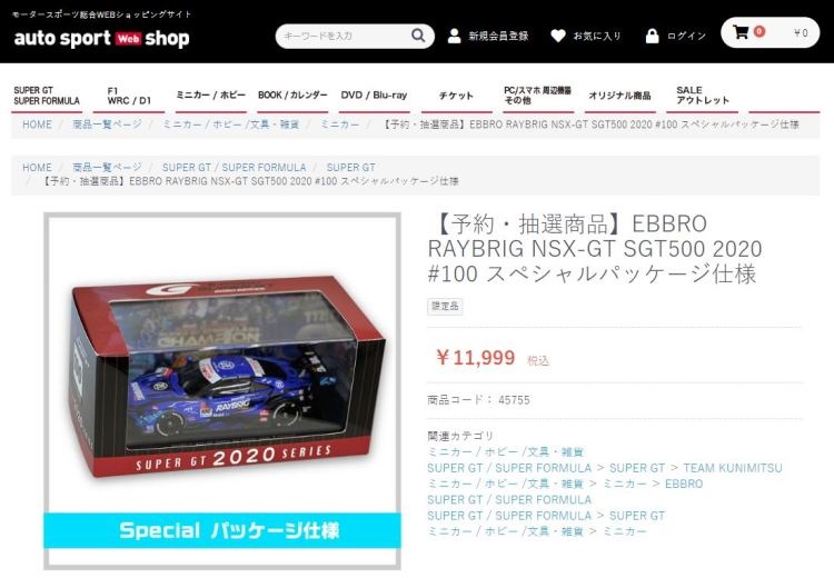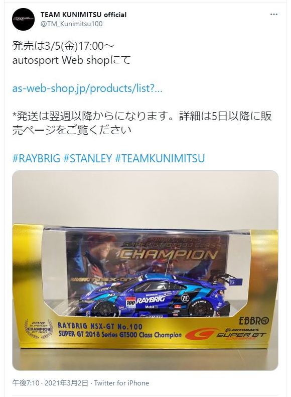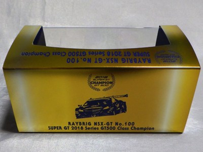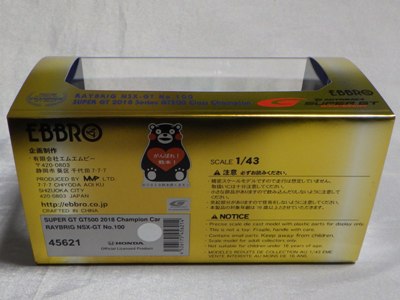 2021年2月10日17時よりエブロオフィシャルショップにて予約が開始され、2021年2月24日に発送開始、自宅には2月27日に届いた。チャンピオン獲得を記念したゴールドパッケージ仕様。 2019年6月14日に受注が開始され、2020年8月19日に発売された同じレイブリックの2018年仕様であるNo.45628より、あとに企画されたものだと思われるが品番が若いのが謎。ARTAのNo.45629に対するNo.45618と同様に、最終戦仕様に変更された商品と思われる。 No.45628との大きな違いは、ルーフがボディーの多くの面積を占めるレイブリックブルーではなく、差し色のメタリックライトブルーに変更されている点。他にもリアフェンダー後部にくまモンが追加されるなど小変更が見られる。 支払い方法としてクレジット払いができず、代金引換のみというのが少々面倒だが、一人様1台限りしか注文できなかったためヤフオクで高騰した(2月26日出品28日終了→25,000円、2月27日出品28日終了→23,500円、2月28日出品28日終了25,000円)。送料・代引き手数料込で12,740円の商品なので転売価格はほぼ2倍である。 3月3日にも22,000円での落札があり、3月6日現在も3点が2万円以上で出品中で、うち2点には入札がある。 2020年の冬に発売予定だったNo.45621の通常パッケージ版(2020年9月3日受注開始)が同時発売になるかもしれないと予想していたが、3月6日現在発売されていない。 この特別仕様バージョンは、パッケージがチャンピオンモデル特別仕様のゴールドになるのみならず、台座も特製のシルバーメッキ仕様になっていて豪華なのだが、白いテープ状の台座ラベルがややチープで浮いた感じがするのが若干気になる。 通常版の受注時に「特別パッケージ入り」を宣伝文句にしていたので、通常版は、パッケージは共通のゴールドでパッケージ内の背景画像と台座だけ変えてくるのではないかと私は予想していたのだが、背景だけ変更した別の商品が先に発売されることになった。 前述したNo.45628のチーム国光オリジナルスペシャルパッケージが9月にauto sport web shop限定で発売されているのだが(私は買いそびれた)、今回もauto sport web shop限定パッケージが発売されることが2021年3月2日にツイッターで告知された 。 予約受付が2021年3月5日17時からということで、今度こそ買いのがしはできないと気合いを入れていたら、なんとまさかの抽選販売であった。昔の限定Gショックや最近の人気ゲーム機などではありがちな販売方法だがNSXミニカーでは初めてかもしれない。受付期間は2021年3月10日10時まで。 |