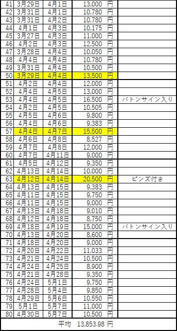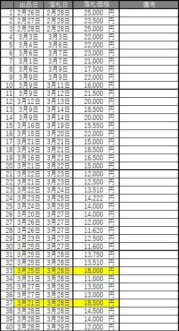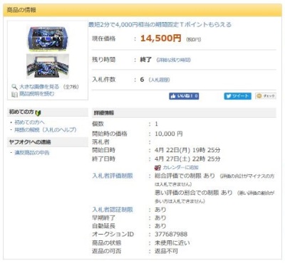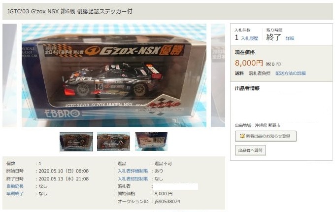 2021年2月10日17時よりエブロオフィシャルショップにて予約が開始され、2021年2月24日に発送が開始されたエブロ1/43「No.45621 RAYBRIG NSX-GT No.100 SUPER GT GT500 2018Champion Car No.100」(税込10,780円)のヤフオク相場を以下に掲載。 当初はオフィシャルショップの限定品と考えられており、珍しいゴールドのパッケージもインパクトがあったので相場も高騰したのだが、2021年3月20日に一般販売が開始されてみたら、なんとオフィシャルショップで販売されたものと完全に同一。その事実が浸透していくにつれ当然相場は下降。 2021年4月末には、開始価格が高額なものには入札もなく、定価以下での落札が通常になっている。 それでも、これだけ長期間にわたって出品も落札も続いている商品は本当に珍しい。 下表の黄色で塗られているものは、auto sport web shop限定で抽選販売された特別な背景入りの商品だが、油断していたら入手できないまま、いつの間にか完全に市場から姿を消してしまった (2025年5月にヤフオクでやっと入手)。 |