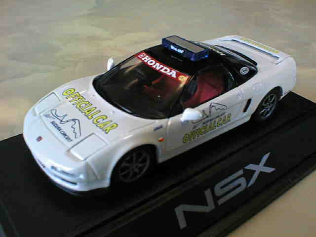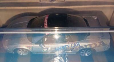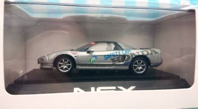【参考画像(未所有品)】 2019年6月9日にヤフオクに初登場した。エブロ1/43「NSXセーフティカー試作品」という触れ込みの商品。 1998年仕様のNSX-GTと同時期に発売されたツインリンクもてぎ仕様。実際に市販されたのは1号車のイエローと2号車のホワイトで、どちらも当時実在した車両をモデル化したものだが、シルバーは存在していなかった。 ボンネットに「2」のナンバーが見られることから、ロードカーのNo.43016シルバーをベースに、トミカにもなった2号車のタンポ印刷のテストをしたものが、ホビーショーなどでアウトレット商品として販売されたものではないかと思われる。 タンポ印刷のテストをするためだけのものなのか、ルーフ上のランプがない。運転席側のドアミラーが欠品とのこと。 貴重なアイテムとして是非欲しかったところだが、開始価格は49,800円と高額で、残念ながら手を出すのは諦めた。 2020年2月13日現在も38,800円に値下げされて出品が続いているが入札はない。 |