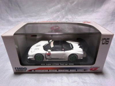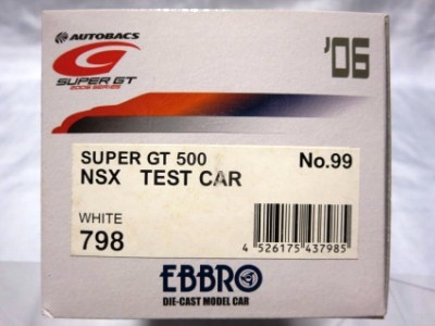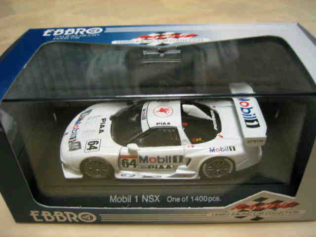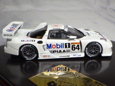 | エブロが初めてリリースしたNSXのGTカーは98仕様4種。ノーマルもロッソ以上に精巧だが、GTではタンポ印刷の細かさなど現代の技術力のすごさを思い知らされた。JGTC年間ランキング2位のマシン。 | HDC(ホンダダイレクトマーケティング)からパッケージだけ換えて販売されたもの。白ボディーにMobil1とPIAAのロゴ。43024と同じ商品。 | ||
