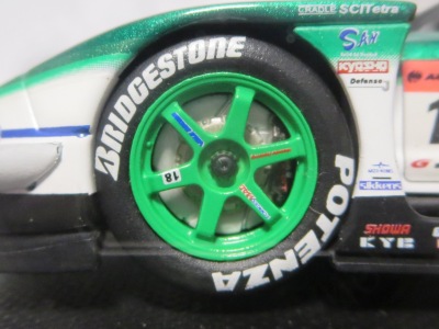 | タカタ童夢の2000年モデル。'99年のホワイトベースからイエローベースに。ドライバーは脇坂寿一選手と金石勝智選手。 | タカタとはタイプの違うゴールドホイールの超細いスポークが必見。JGTC年間ランキング1位。ドライバーは道上龍選手。 | ||