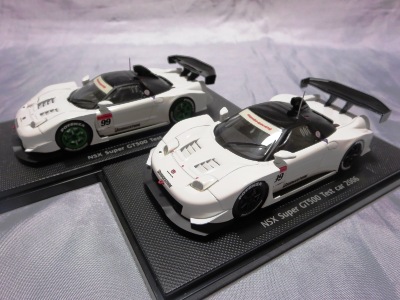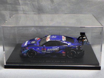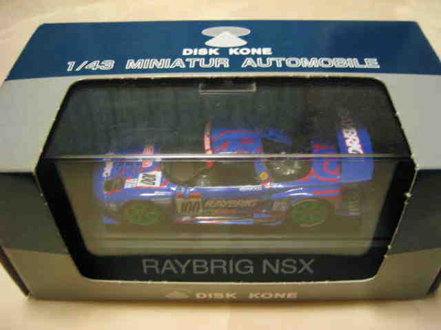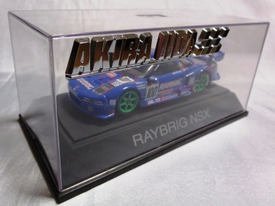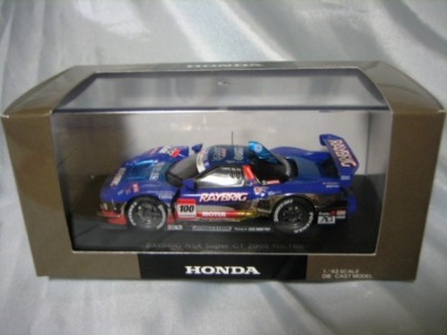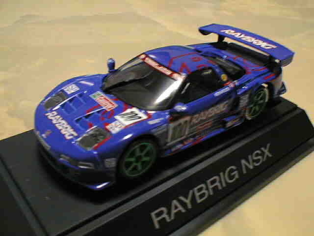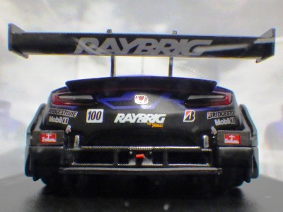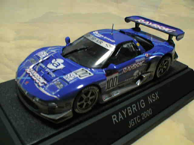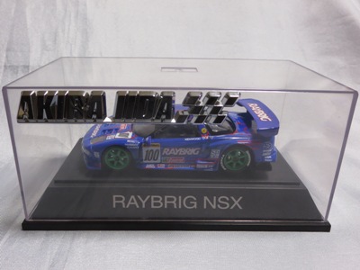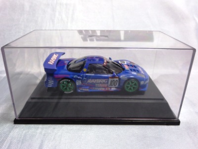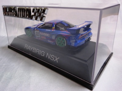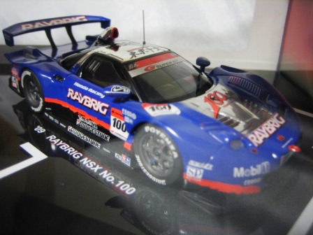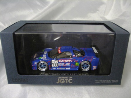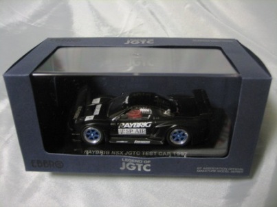 | 2010年1月9日発売。レジェンドオブJGTCシリーズ。カーボンむき出しのボディを、単なるつや消し黒で済まさずに見事に再現している。市販車に限りなく近いシルエットが、巨大化したGTカーを見慣れた目には新鮮。 イベントで、細部の異なるサンプル品が販売されたが、そちらは未入手。 | 2010年2月19日発売。台座には「RAYBRIG NSX JGTC 1997 DEBUT」とあるが、パッケージラベルの商品名は「RAYBRIG NSX JGTC 1997 Rd.2 Fuji」となっている。前年の9月18日に発売された1997仕様のバリエーションで、フロントウインドウのステッカーとリアウイングの色が異なる。 | ||