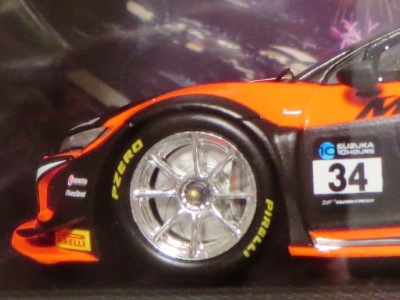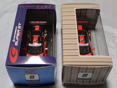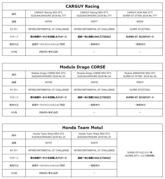 「SUZUKA10HOURS2018」に参戦したCARGUY、Dragoには鈴鹿限定10HOURSパッケージ、一般10HOURSパッケージ、通常パッケージの3種が、Motulには鈴鹿限定10HOURSパッケージ、一般10HOURSパッケージの2種が存在し、パッケージ違いは、中身のミニカーが同じでもすべて品番が異なる(通常パッケージはミニカーも通常仕様のスポンサーロゴで、10HOURS仕様ではない)。 鈴鹿限定パッケージ3種は2019年8月23日に発売され、CARGUYの通常パッケージ(2019年4月2日に受注開始)、Dragoの通常パッケージと、Motulの一般10HOURSパッケージ(共に2019年6月4日に受注開始)は2019年10月18日に発売された。 CARGUYとDragoの一般10HOURSパッケージ(共に2019年6月4日に受注開始)も同時に発売予定だったが、当日発売延期が発表され、2019年11月19日にやっと発売された。 |