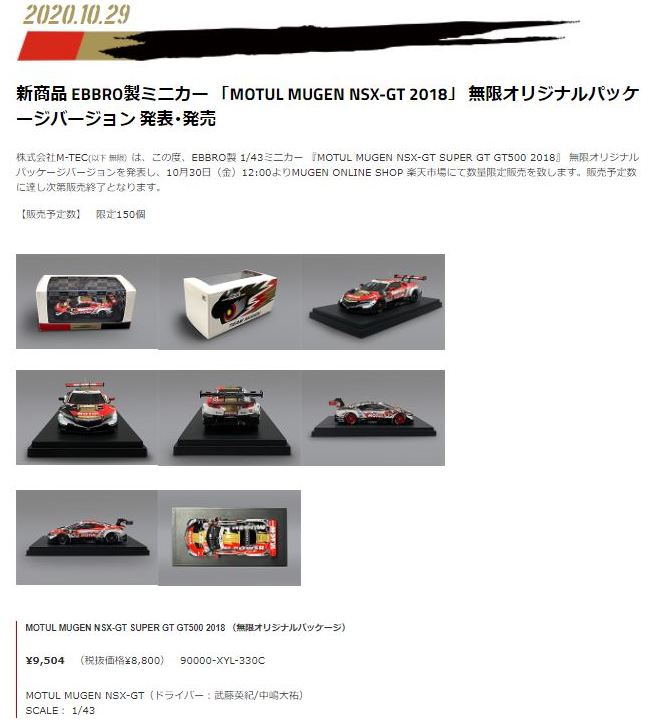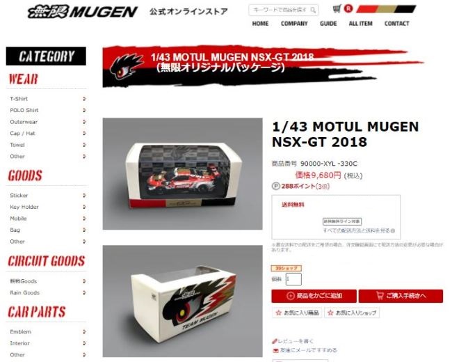 2018年12月9日にツインリンクMOTEGIで開催された「ホンダレーシングサンクスデイ2018」のエブロブースで先行販売されたエブロパッケージに対し、無限ブースでは無限オリジナルパッケージバージョンが販売され即完売した。 このオリジナルパッケージは12月17日11:00から無限オンラインショップ楽天市場で一般販売もされたが、こちらも1時間もたたないうちに即完売。こちらの品番は90000-XYL-330Aとなっており、価格は同じ。 |