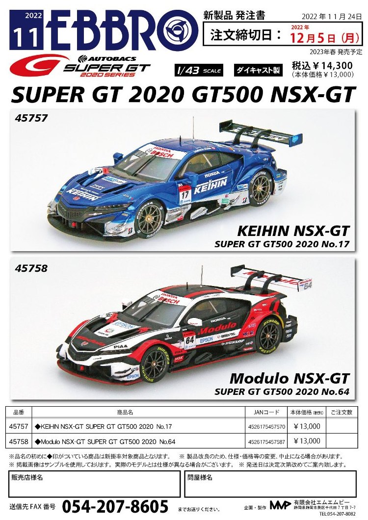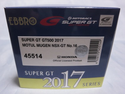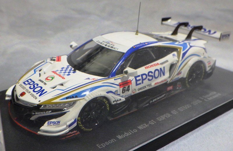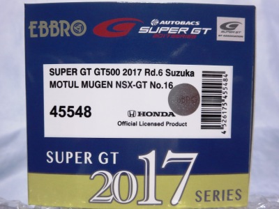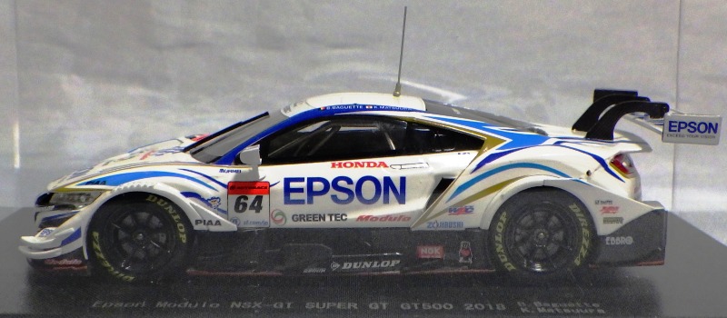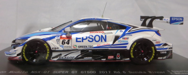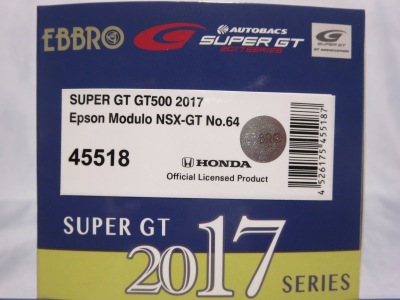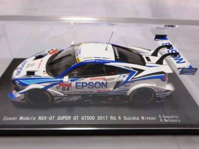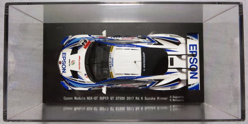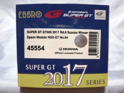 2019年1月18日発売。 Rd.1→Rd.6の順に発売されたMOTUL MUGENとは逆で、Rd.6→Rd.1の順に発売されたEpson Modulo。 2018年8月29日から受注を開始し9月に発送された「No.45554 Epson Modulo NSX-GT SUPER GT GT500 2017 Rd.6 SUZUKA」よりも4か月後 に、MOTUL MUGENのRd.6仕様と同時にリリースされた。 |
